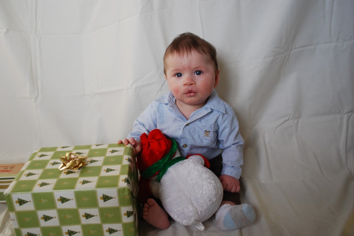 After a much unsuccessful first try we tried again. This time I was inspired by one of my fellow classmates photos of his twins wearing just santa hats. I thought it was a genius idea. Spit up and slobber could be wiped away easily and they look so darn cute in those hats.