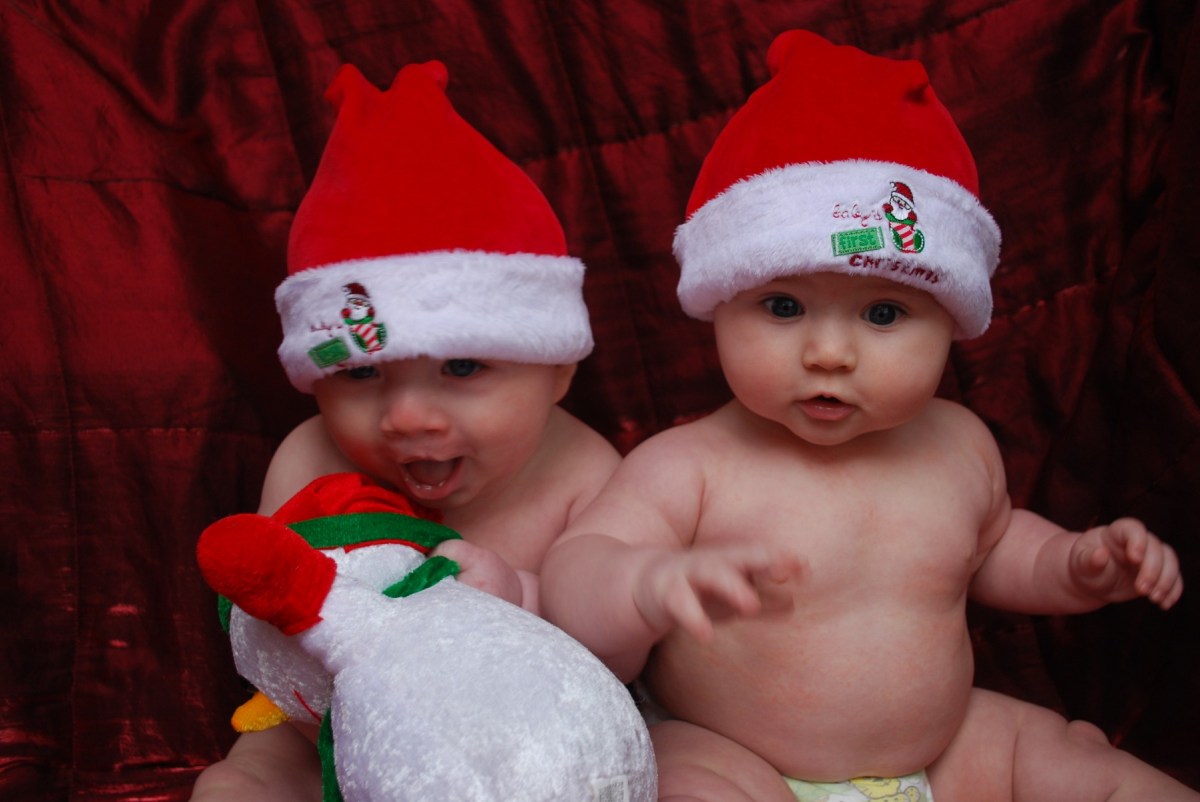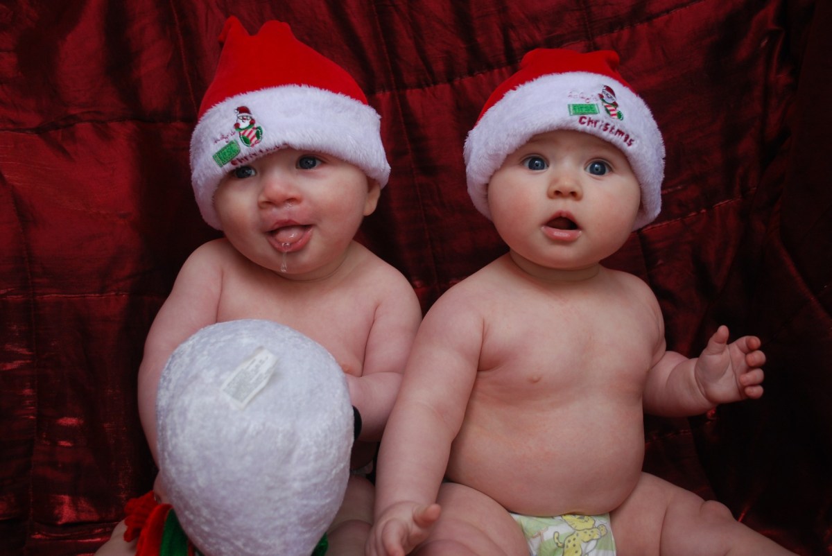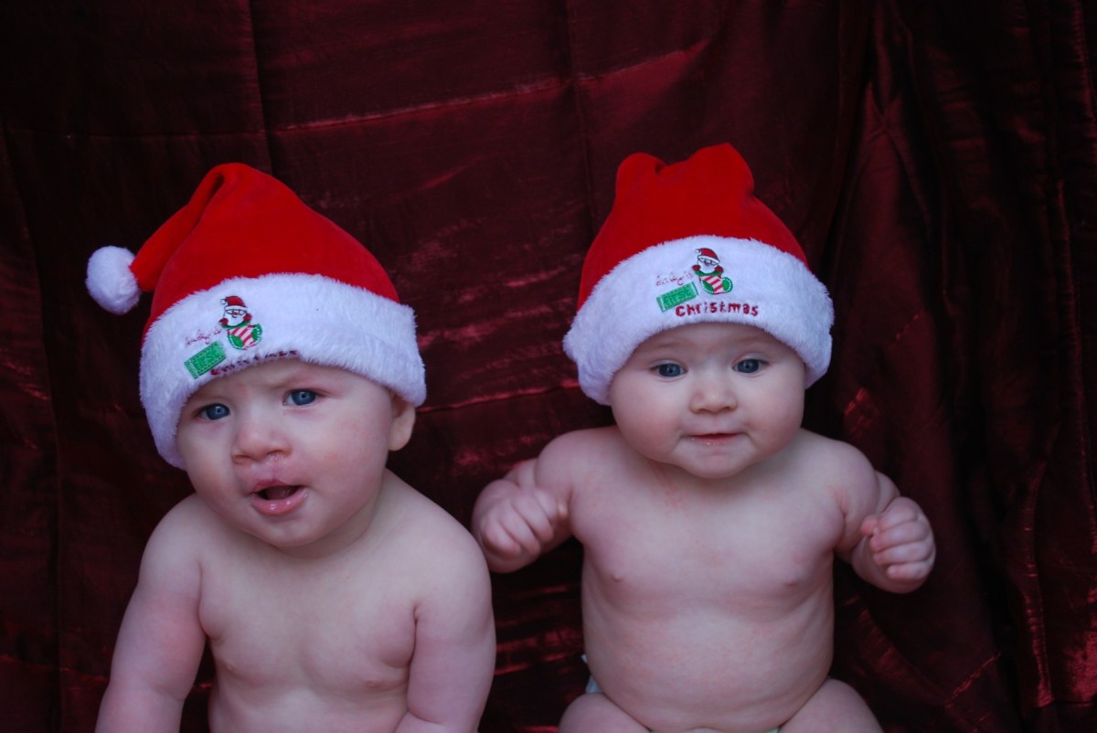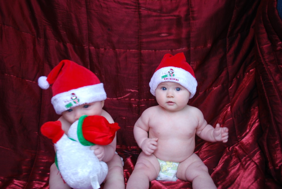 After attempting to get the twins photos done in their nice clothes and failing. I had seen this idea of just shooting babies in a diaper because you can just wipe off slober. I found some Santa hats and thought it would be cute to put them on them in diapers and get photos.