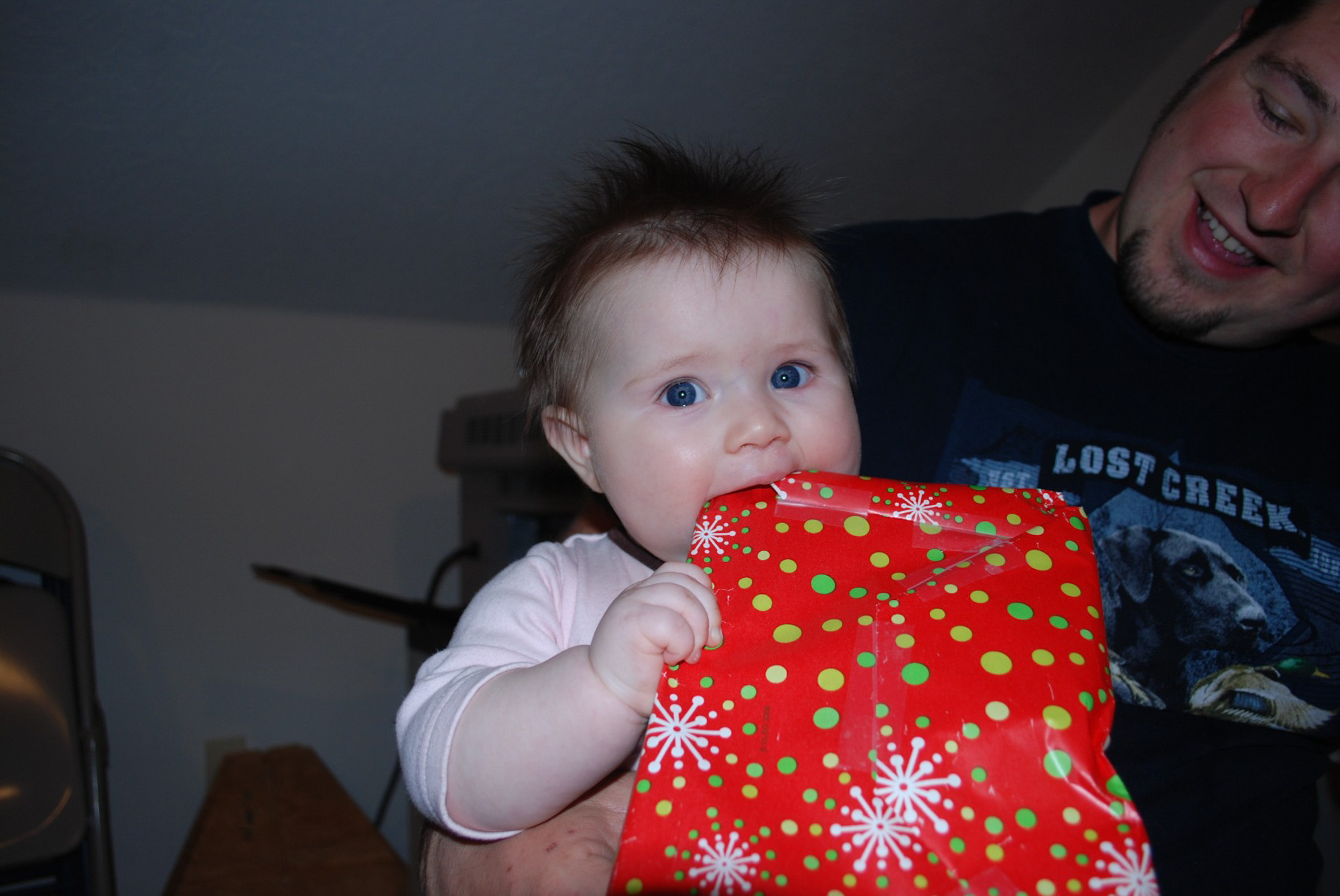 The twins would rather chew on their present then open them.