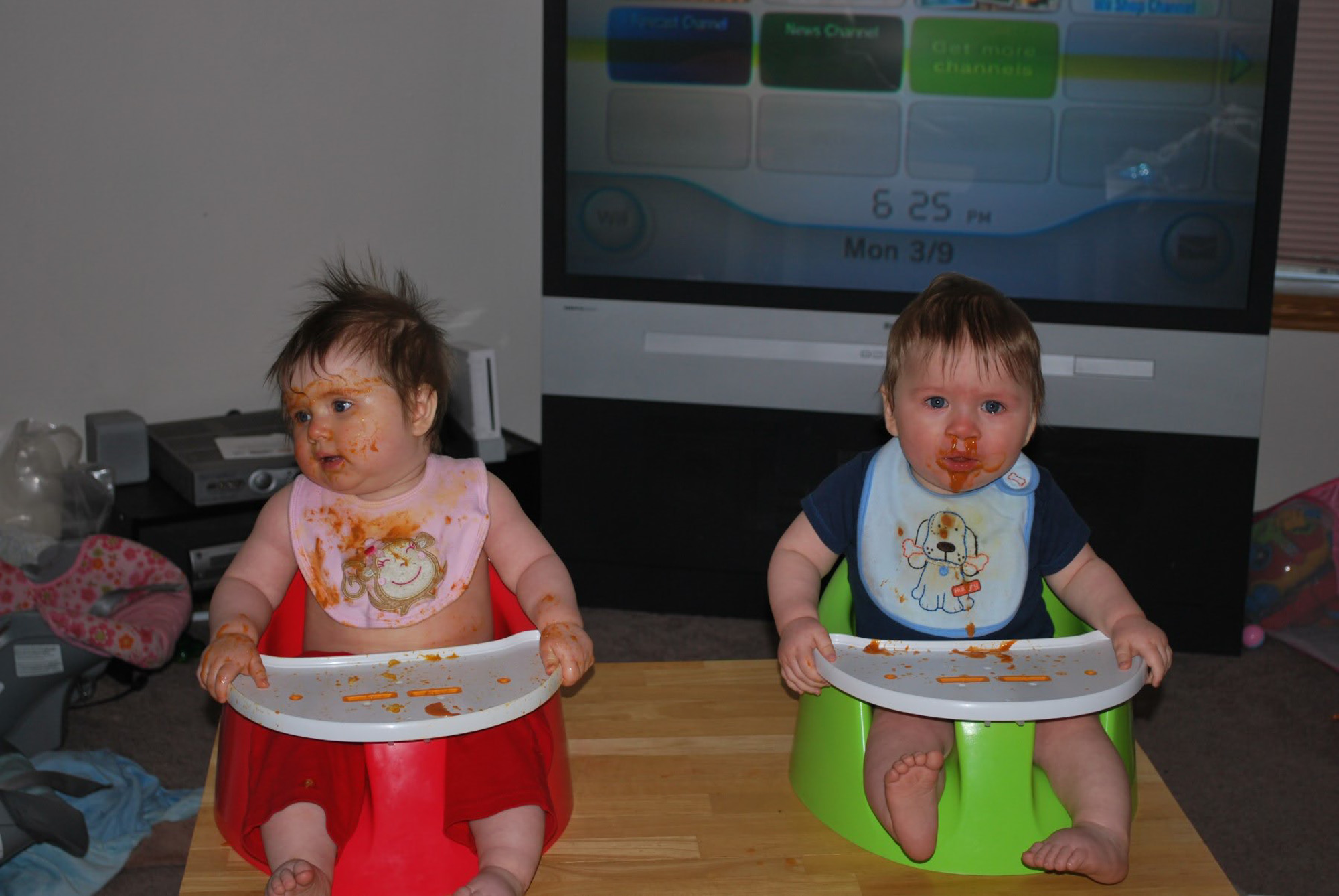And this is what happens when Dad is home alone with the babies. I went out to dinner with some of my girl friends and I come home the babies are in bed and all seems well………until Greg shows me the camera with pictures of what happened while I was gone. I couldn’t stop laughing. They are covered in food. They were almost cleaner when they fed themselves. Apparently Jaelee tried to grab the spoon when Greg was feeding her and then she rubbed her eyes. So Funny!