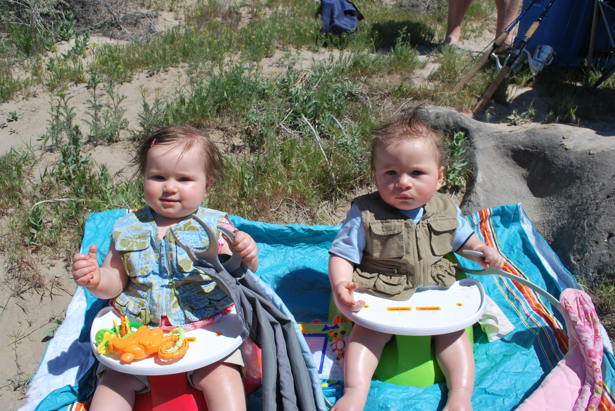We took the twins on their second fishing trip. I forgot to bring them a hat or anything for shade covering. I tried to use the cover on their car seats. I took them off but they just wanted to play with them. I did remember sunscreen though so I smothered their whole head with it, right into their hair. We of course had to use their fishing vests I got from my co-worker.