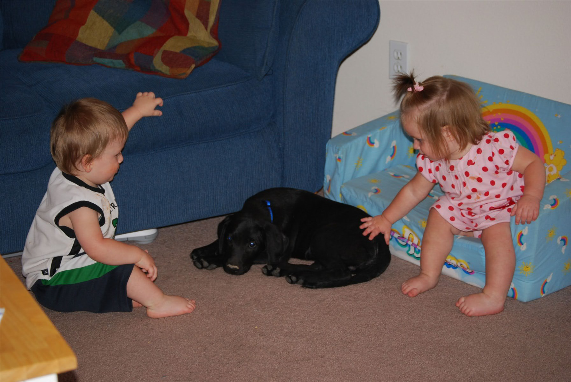 Even before I was pregnant Greg and I wanted to get a dog but we lived in a small townhouse and I didn’t think it would be fair to the dog to live in such a small place. Then when I got pregnant I wanted a dog even more (must of been some maternal thing) but again thought it would be unfair to the dog because when the twins came I knew all our attention would be going towards them and we wouldn’t have as much time as I would like to devote to a dog. Then on our first Christmas we wanted to get a dog for the twins but they were still pretty little and we were still living in our small townhouse so again we decided not to. But finally the time was right, with the kids being older and easier to take care of and a big yard we made the decision to get one. So Greg went and picked up this adorable black lab yesterday that we named Bo.