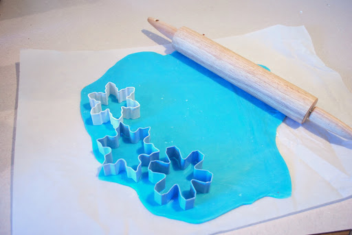 I wanted to decorate my cake with cute flowers but I don’t have flower cookie cuters and couldn’t find any at the store so I got some snow flake ones instead. I used blue food coloring to turn my fondant blue and rolled it out. I cut out my snow flake shapes and then made my cake.