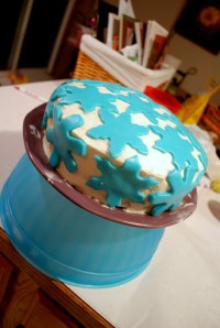 I just made a cake from a box. I don’t care for vanilla cake so I used spice cake with cream cheese frosting. Once my cake was frosted I added my snowflakes to it. I thought the white and blue would make it look wintry but it doesn’t. In fact it looks nothing like I envisioned. It looks like a mad hatters hat or a cake with star fish on it. Greg said maybe I put too many snowflakes on it. I don’t know it just looks funny. Anyway I will try decorating my cake again with fondant but wont use blue snowflakes.