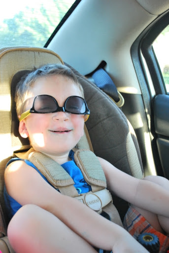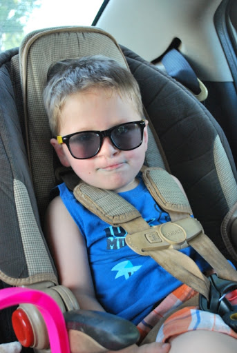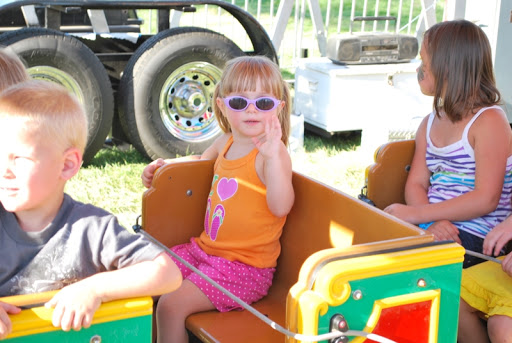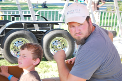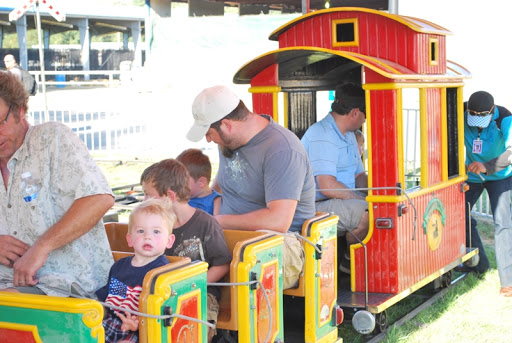 After looking at all the animals we went to the rides to see if the twins were tall enough yet to ride some. This year they finally were. We decided to put them on a little train ride. Jaelee hopped right in and started to buckle herself in. Jayse had a screaming fit and didn’t want to ride it by himself. Greg reluctantly rode the ride with him.