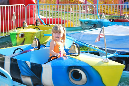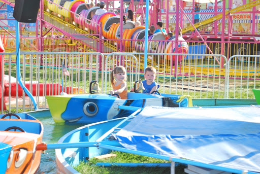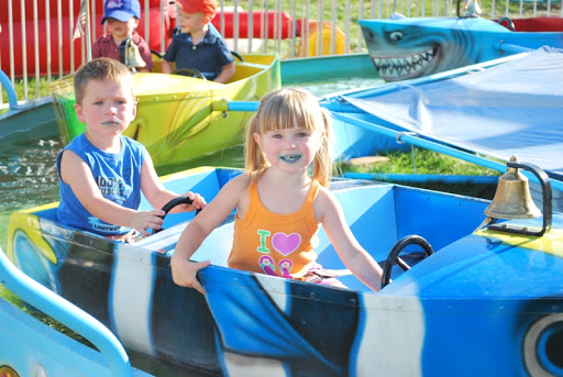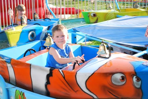 We walked around and found another ride the twins could go on. Jayse was ok with going on this ride without his dad. He rode in the same boat as Jaelee behind her. They liked it so much that they rode it a second time and Jayse got his own boat.
