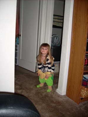 Ha Jaelee came out of Ian’s room with his Halloween costume on. I think she’s a little big.