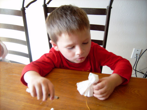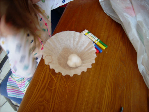 The twins and I made ghosts out of coffee filters and cotton balls. Then we hung them from our light fixture in the dining room. They did a very good job. We also hung up some Halloween guys we colored last year. It looks lovely!