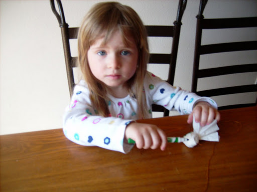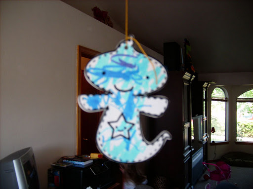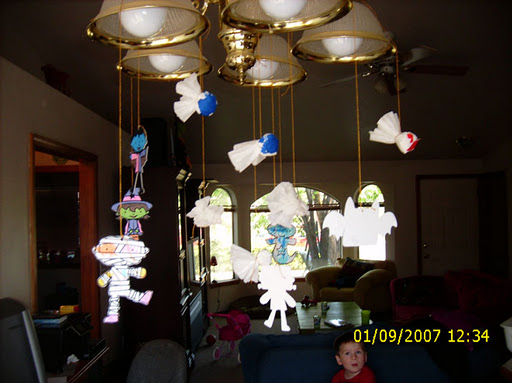 The twins and I made ghosts out of coffee filters and cotton balls. Then we hung them from our light fixture in the dining room. They did a very good job. We also hung up some Halloween guys we colored last year. It looks lovely!
