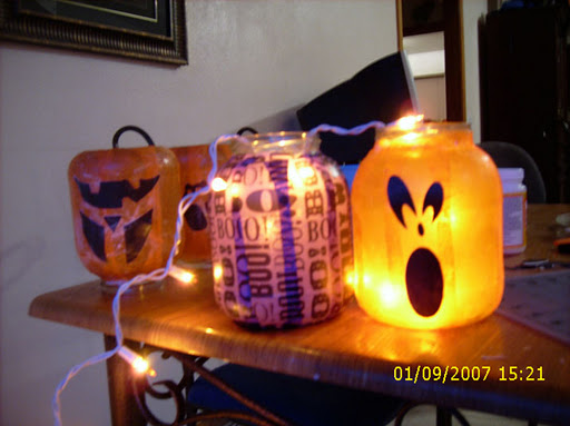 Then I worked on this Halloween craft I have been trying to do for 2 years. I saw these on a blog several years ago and wanted to do it so I saved pickle and other various jars for a year. Last year I bought the tissue paper and other supplies and did one. I put all the stuff back and saved jars for another year so I could actually do some this year. This year I finally made a whole bunch and loved the way they turned out. I am starting to think of a way I can adapt it for Christmas because I have a ton of jars left and it’s really easy to do. Here is a link for the tutorial if anyone wants to try it out: for the pumpkins for the monsters