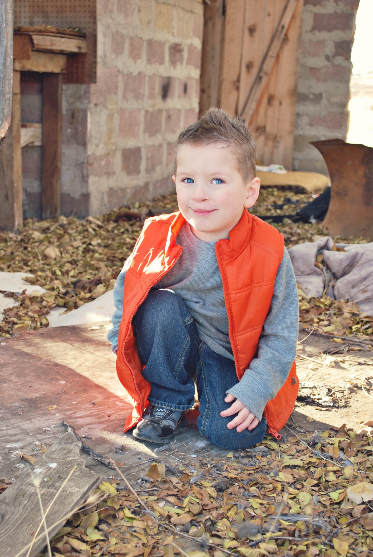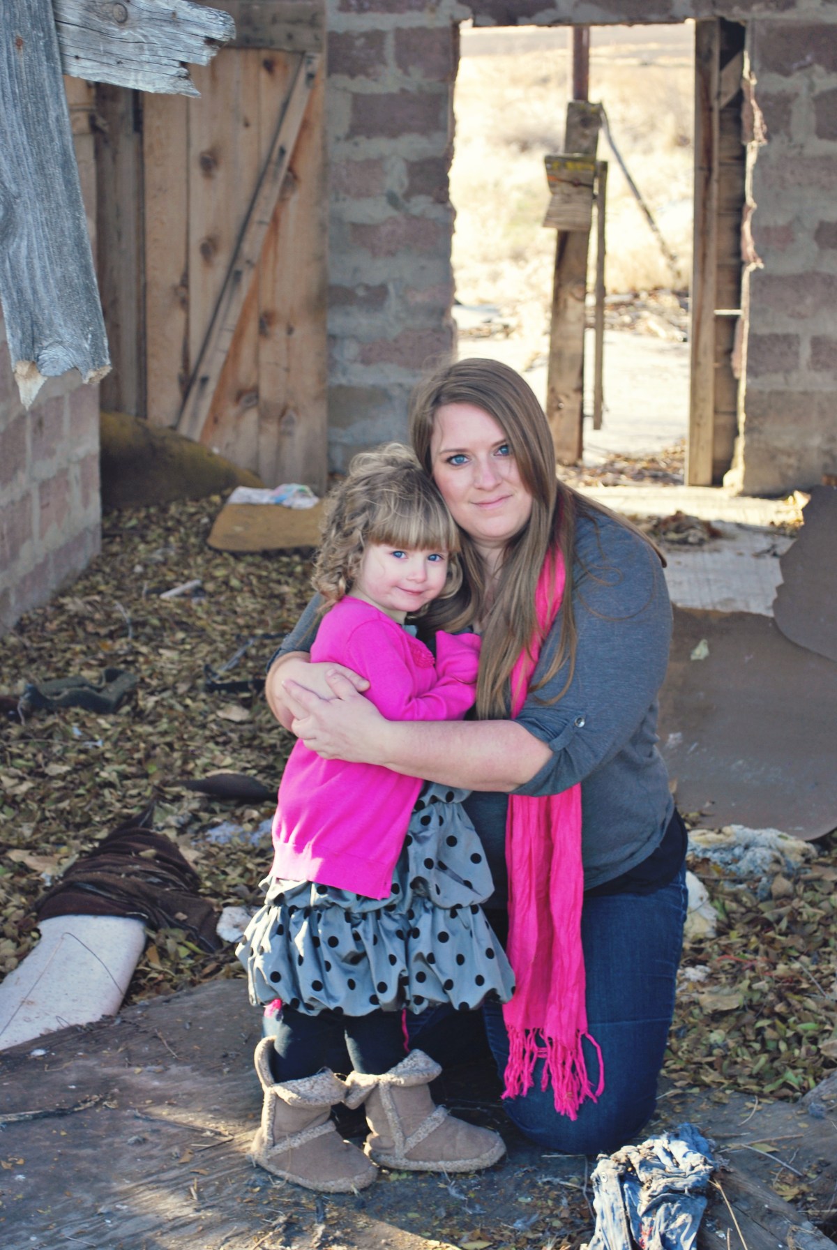I found other photographers pictures that I liked and they were taking their photos in Star, ID so I wanted to go there and find the cute barns and old cars they were taking photos in front of. So we headed out to Star. We got to Star and it was not what I was expecting. There was a lot of new homes and subdivisions. Where are all those cute old barns? We drove around on some roads for what seemed like forever until I finally saw this old falling down house and decided we would just settle for that. I was hoping that it would help block some of the wind. It was FREEZING cold outside and windy. Of course we couldn’t wear our coats because that would ruin the color coordination I was going for and not look good.