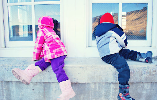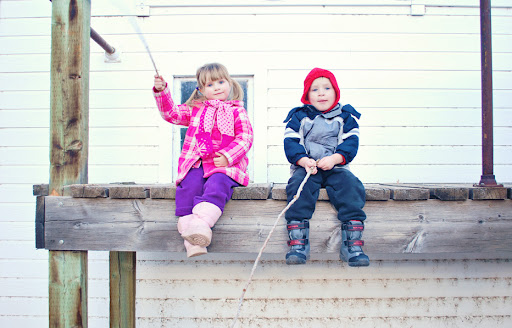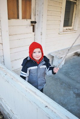 The kids found some sticks and they went into the porch of this old house that was by the dam and played for a while.