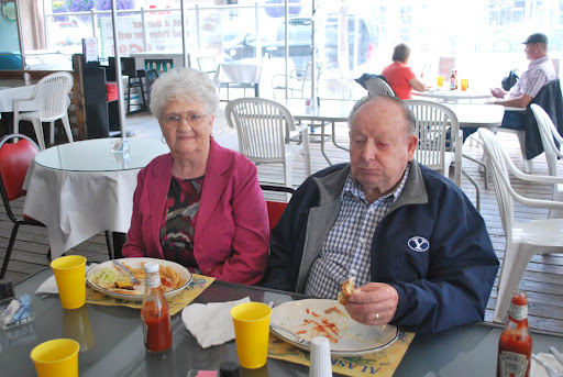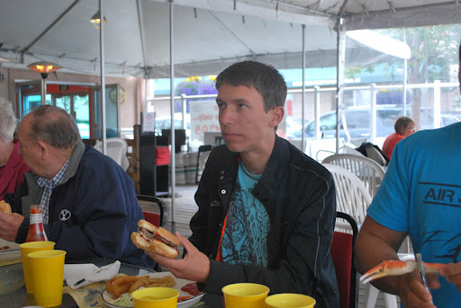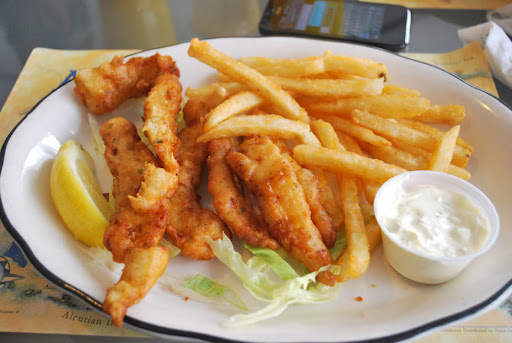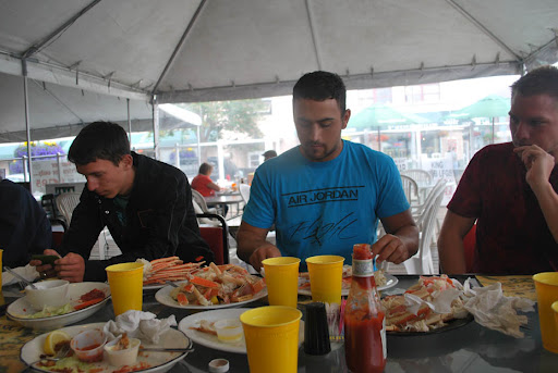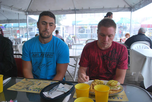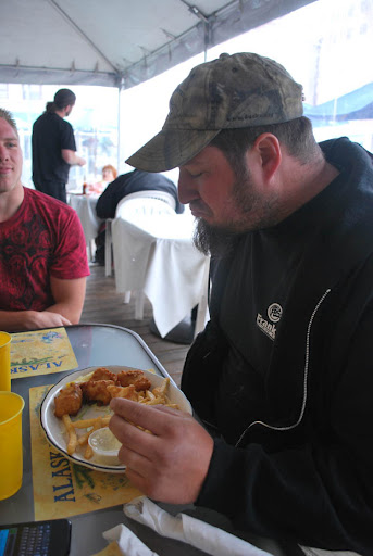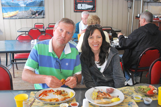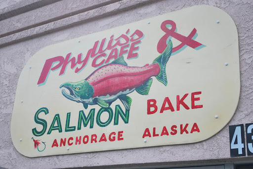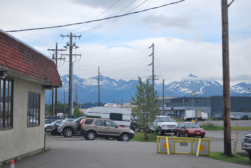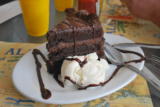 After getting the vehicles we headed to get something to eat. We found a restaurant in downtown Anchorage called Phyllis’s Cafe & Salmon Bake. It was a great spot for our first meal in Alaska because they had a nice selection of Alaskan food – reindeer & buffalo burgers, halibut fish and ships, baked salmon, crab and many other great options of the kinds of food I expected in Alaska. I got the fish of the day (cod) fish and chips with a cup of clam chowder. Greg got the halibut fish and chips. Both of us thought it was really good. The fries were beer battered and fabulous. My cousin Jaron got the all you can eat snow crab and shared some with Greg, I got to try a bit and thought it was pretty good (not a huge crab fan). I was glad Greg liked it because he is always saying he’ll only eat fresh crab that he catches from the OR coast. For dessert Greg and I shared this enormous piece of chocolate cake and it was so good.