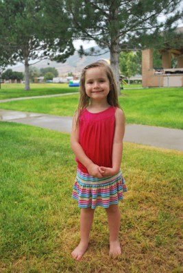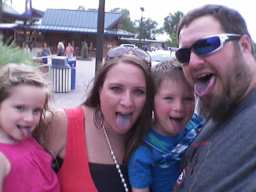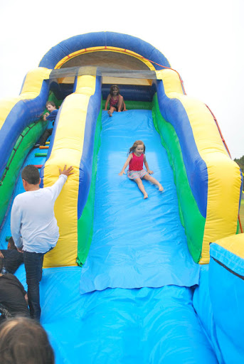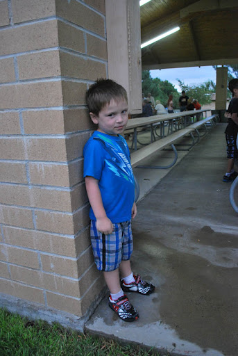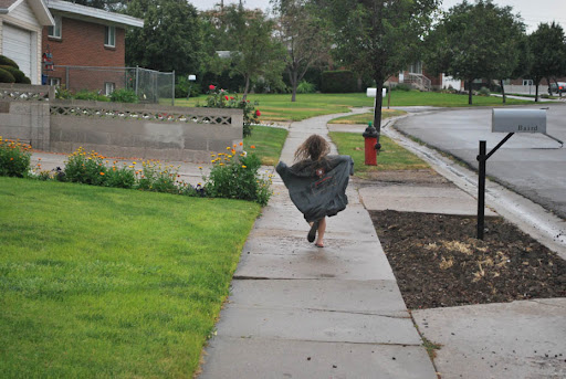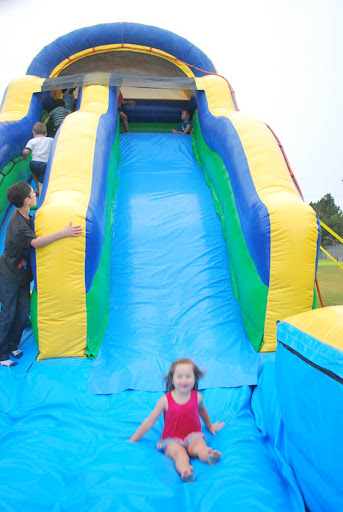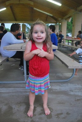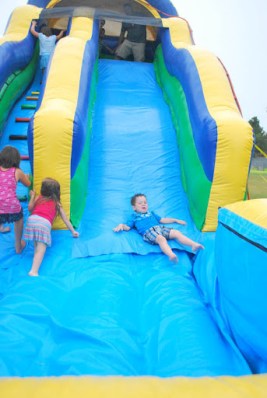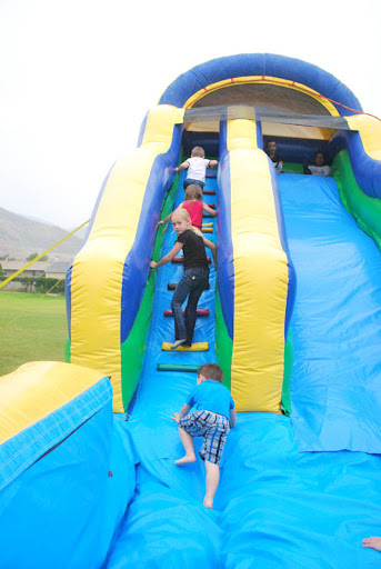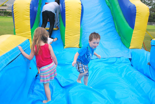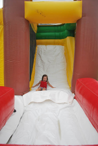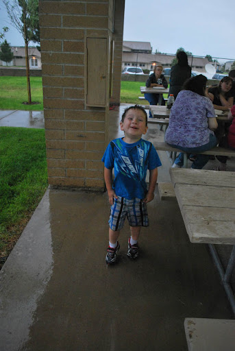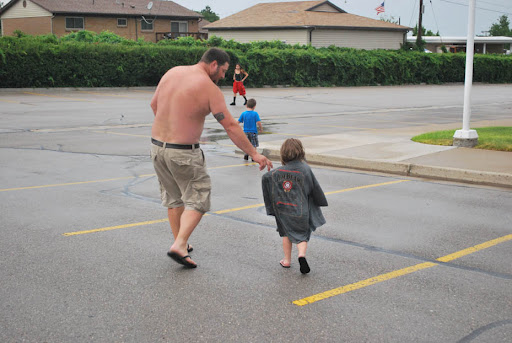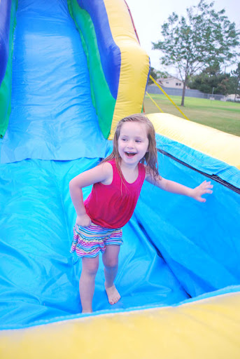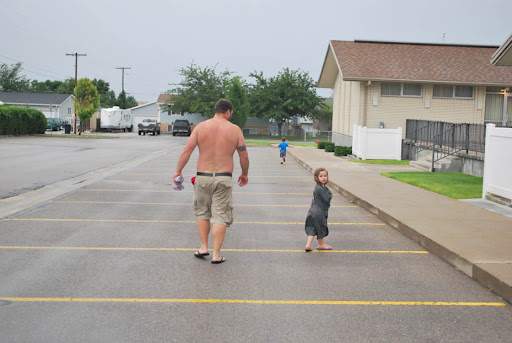 My mom’s neighborhood was having a BBQ so when we got back from the zoo we headed over to the BBQ. They had some blow up toys for the kids to play on and some really good food. It had started to rain but that didn’t stop all the kids from playing on the toys. J & J was soaked and freezing so we headed back to my moms. On the walk back Greg took off his shirt for Jaelee to wear because she was so cold. She thought it was fun running around in daddy’s shirt.
