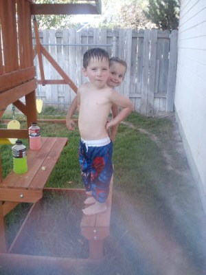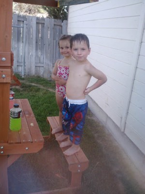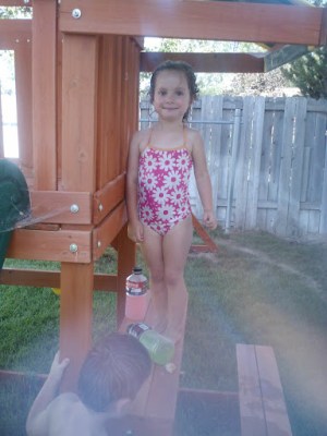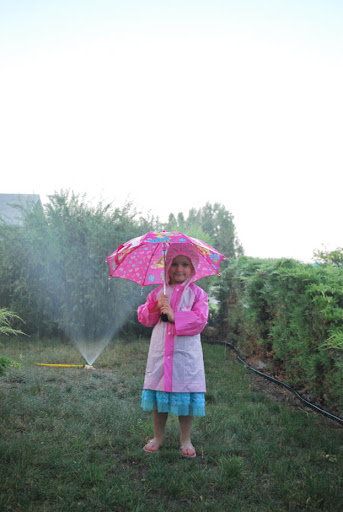 (Jaelee had to go get her rain gear to wear underneath the sprinkler. I thought that was cute)
