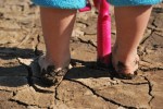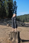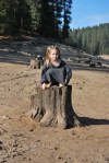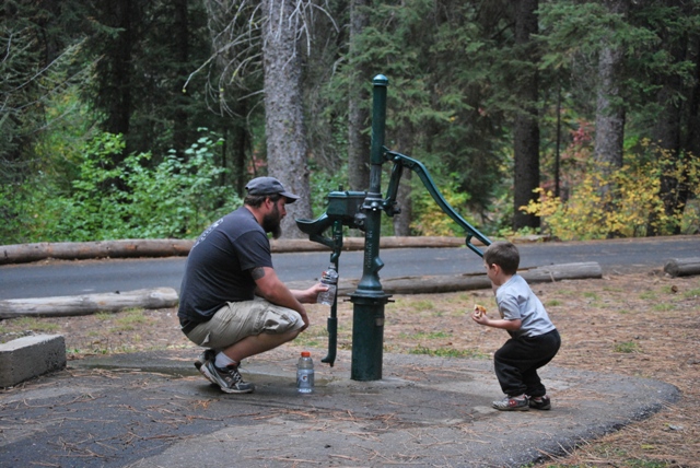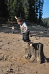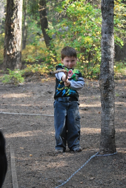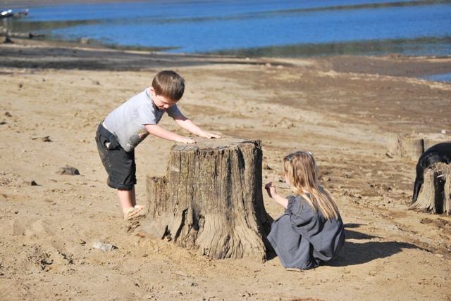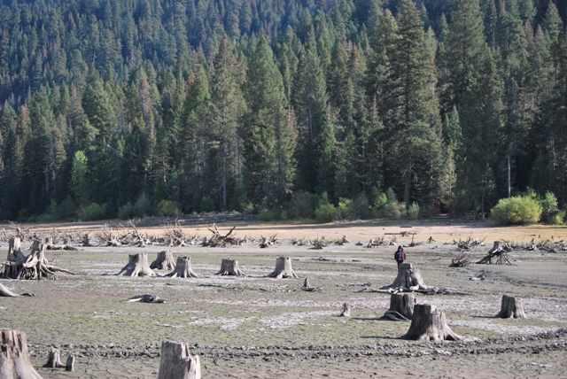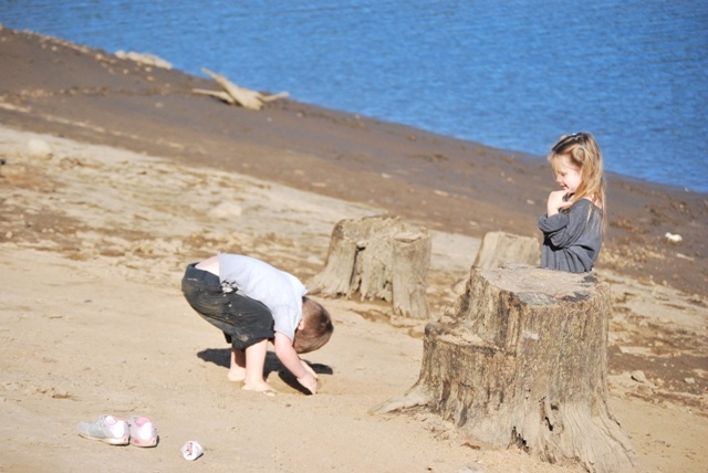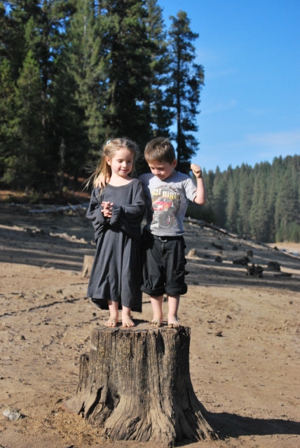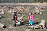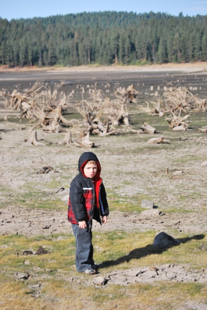 There was a trail to the water right by our campground. We started down the trail, got out of the trees to a clearing where we could see the reservoir. What we saw was not exactly what I had in mind. The water was pretty much gone leaving a large flat land with dead tree stumps all over it. Far off in the distnace we could see a small bit of water and some people fishing. I thought we could walk across the dry part of the reservoir to get to the water but as we ventured out on it I found out it was super muddy. Jayse got close to a small trail of water where it was really muddy and feel face first into the mud. He was crying and wanted to go back to take a bath. He was done with our adventures. We walked back to the trailer, changed clothes and waited for dad to get back from hunting.