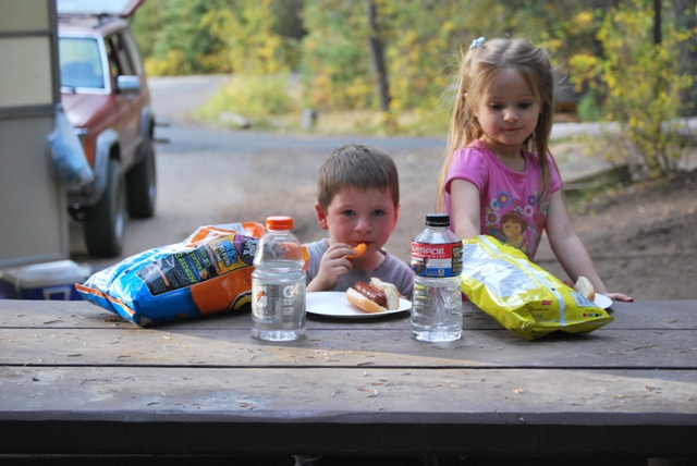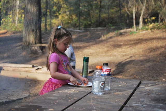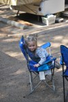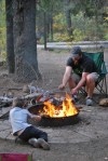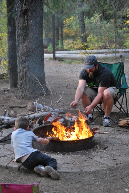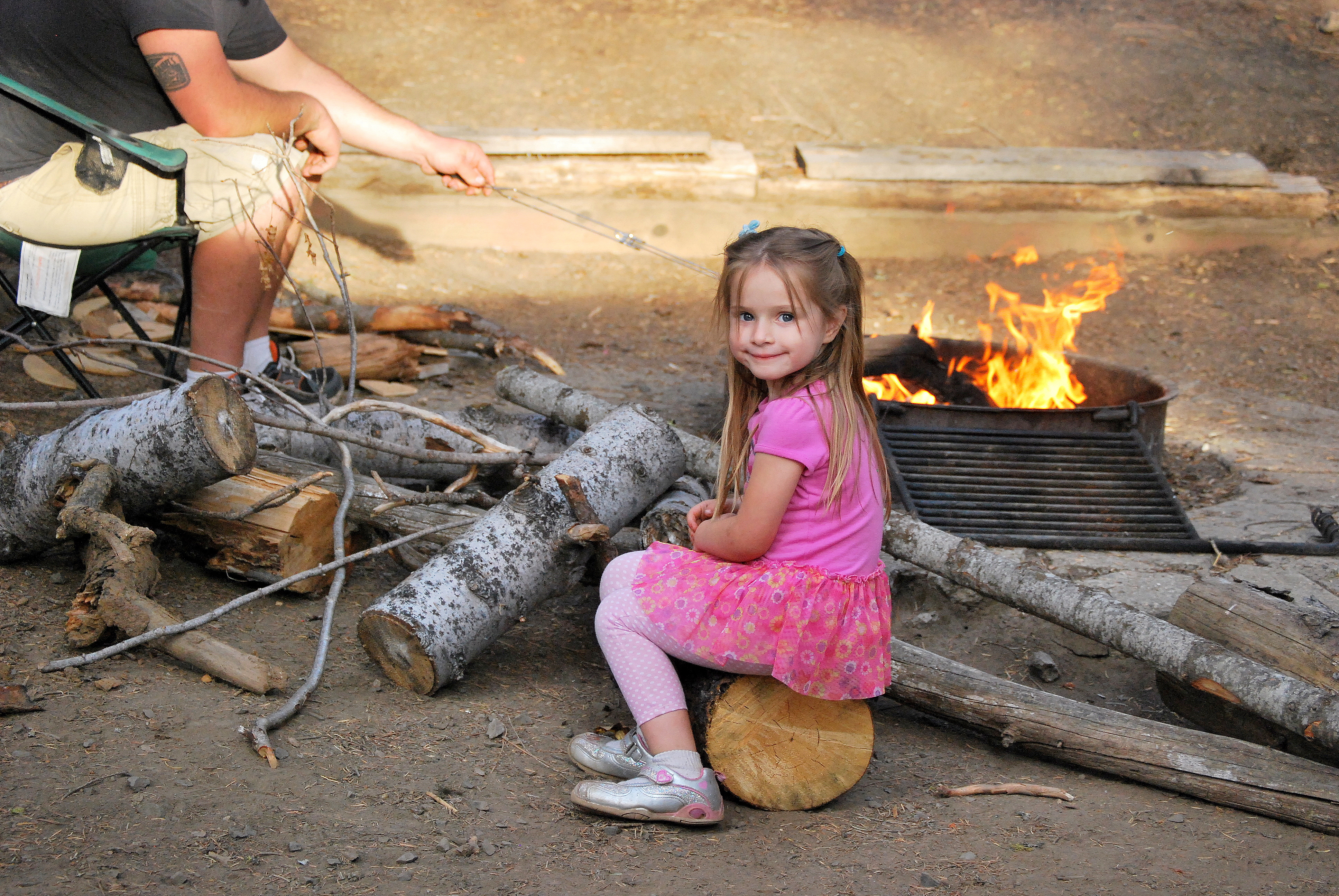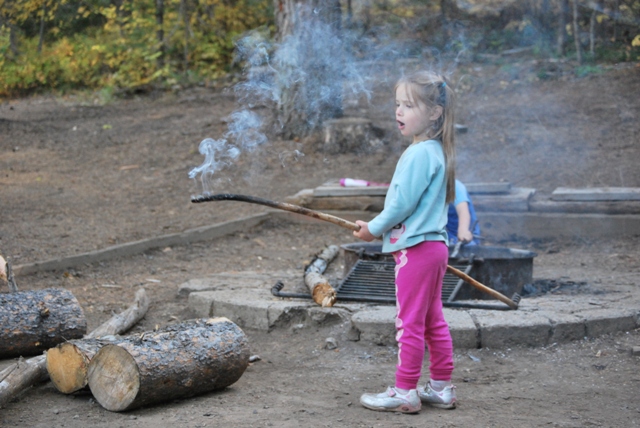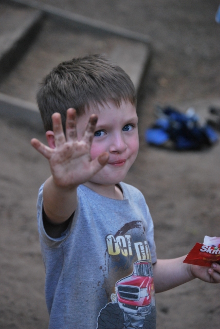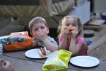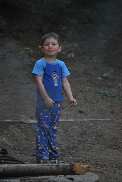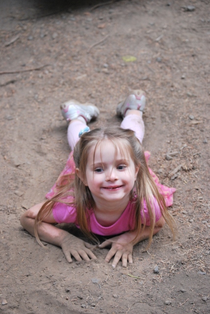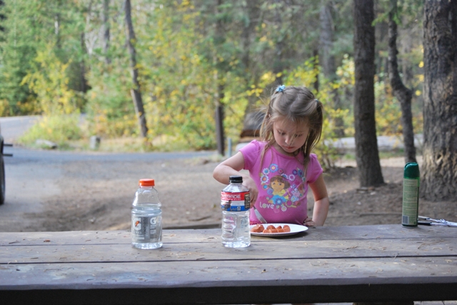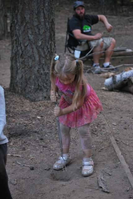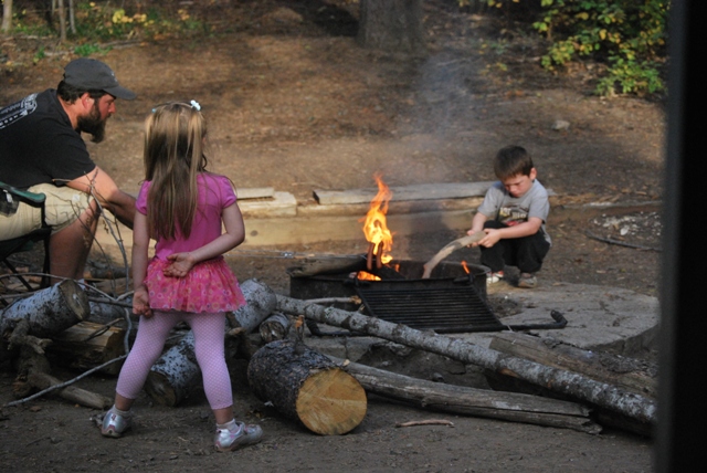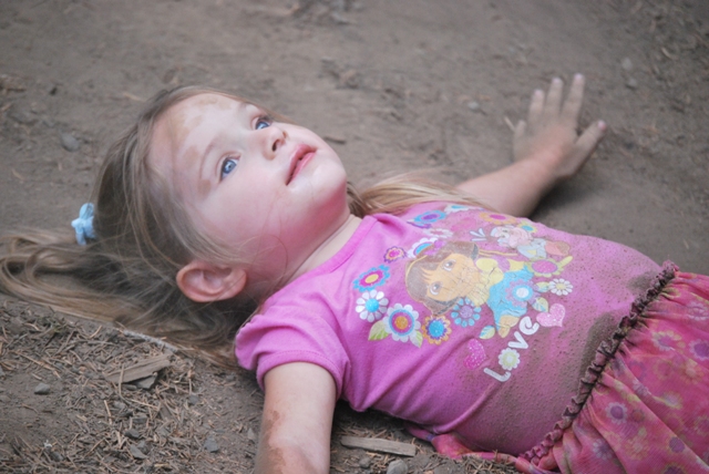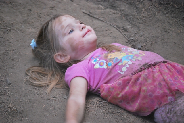 After fishing we went back to our camp site and ate hot dogs, watched movies and hung out by the fire. Jaelee rolled around in the dirt and made dirt angels. She looked really cute and got really dirty.