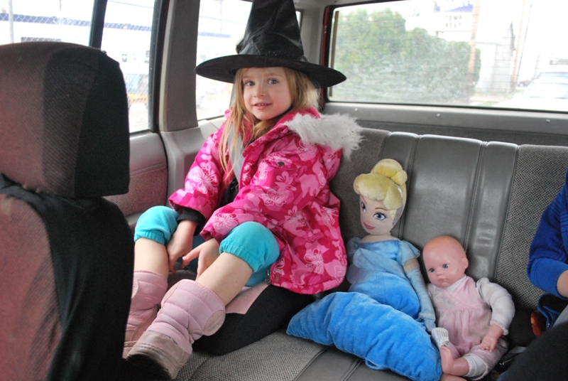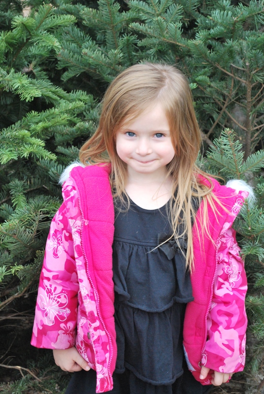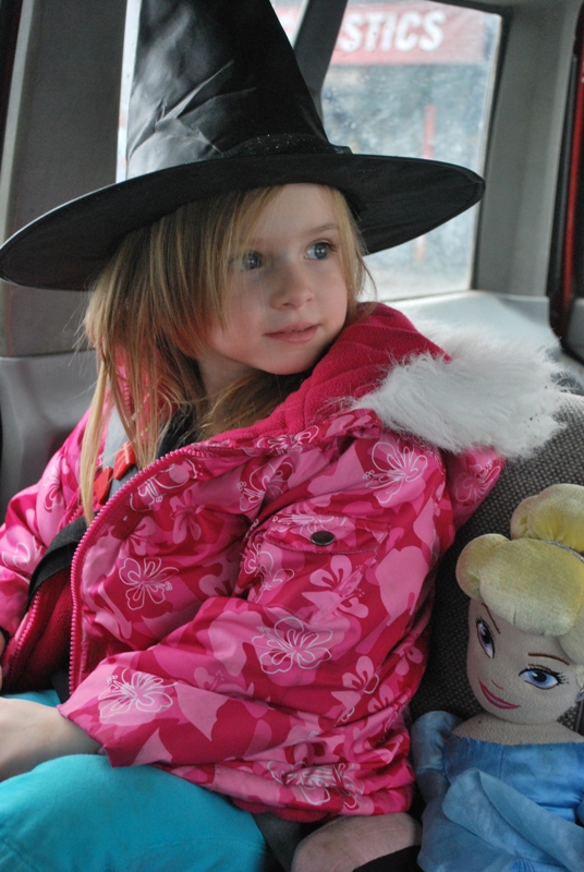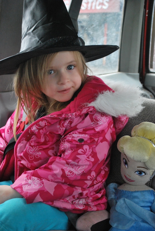 We went and got our Christmas Tree on Dec. 1st. I like to get it up as soon as possible so we can enjoy it as long as possible. We went to our usual place to get our Christmas tree. They are the cheapest in town and have some nice looking trees. Earlier in the day Jaelee had found a witches hat and decided to wear it with one of her black dresses.