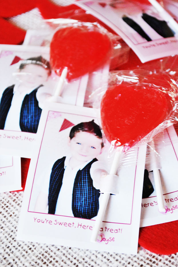 I had taken pictures of the kids for the Valentine’s cards back in January. I had them hold out there hand like they were holding something and then I sized the pictures with a border and a little saying so that I could print them on wallet sized pictures. I had them printed at Costco then I cut them out and stuck a sucker in their hands.