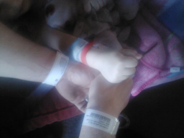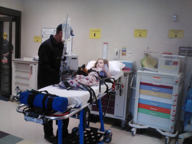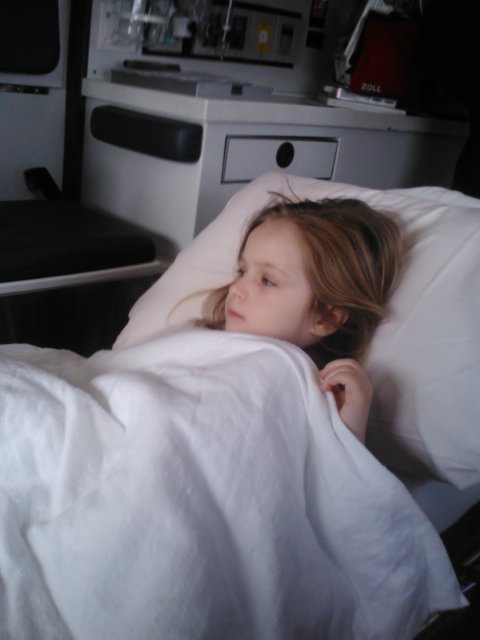 Jaelee was really sleepy and just wanted to be held and go to sleep. We didn’t have to wait too long before we were in a room. They got an IV in her and took her blood. Once she was relaxed I told Greg to take Jayse home so they could eat some lunch and I told him I would call him if anything came up. A couple hours after he left the doctor came in and told me they were going to transport Jaelee by an ambulance to the ER downtown to so that we could meet with a pediatric surgeon to discuss our options for surgery because they thought there was a large possibility it was her appendix. I called Greg to tell him the latest and just broke down, the possibility of her having surgery was scary. He said to let him know when we were on our way downtown and he would meet us there. While we were waiting for the ambulance they gave her some morphine for the pain, she ended up having a local reaction to it and they just kept a close eye on her arm and later but a red band on her that said morphine and told me that they were going to update her charts to say she was allergic to it. After several more hours we were finally in the ambulance on our way downtown.