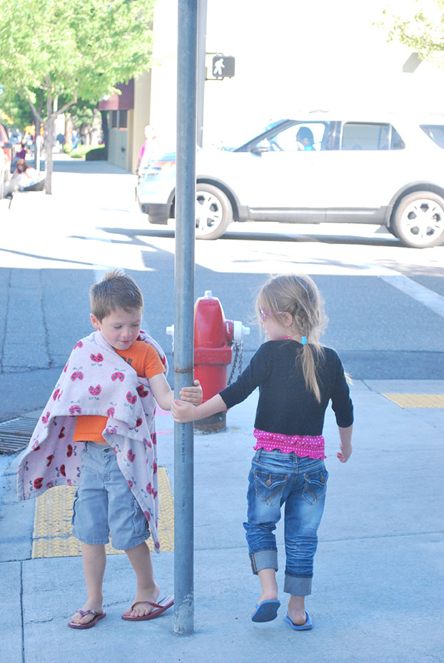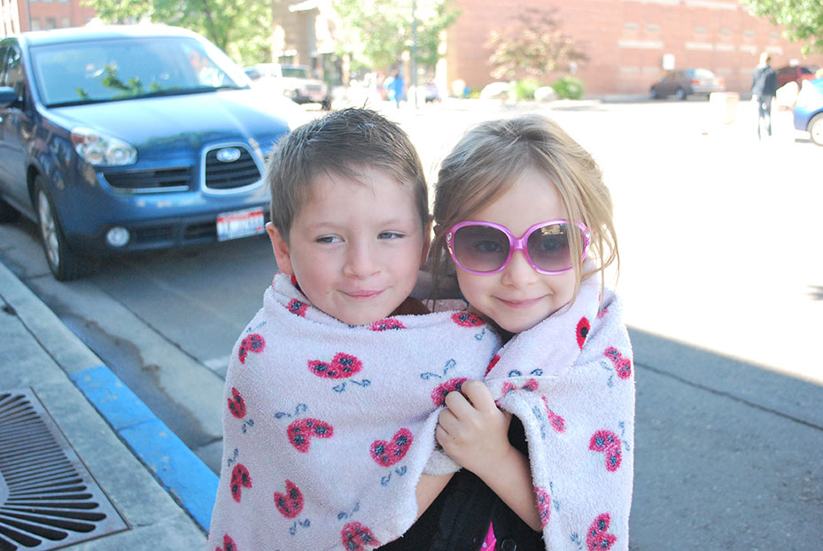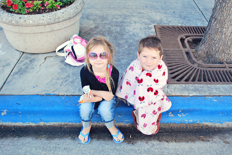 The day of the circus they were having a parade downtown. Greg had taken Jayse a couple of years earlier and said it was awesome with elephants and dancing. Greg had to work so I took the kids by myself. The parade was a bit under whelming. No elephants, no candy and it was cold. Jayse was just wearing a shirt and shorts and he was freezing. Luckily Jaelee was wearing more clothes and she brought her favorite blanket with her. She graciously let Jayse use her blanket to keep warm.