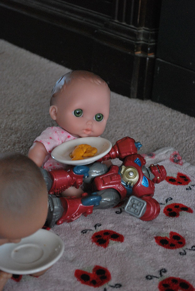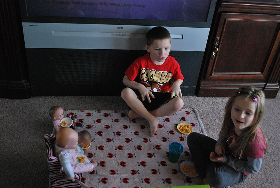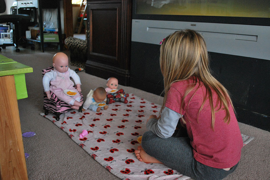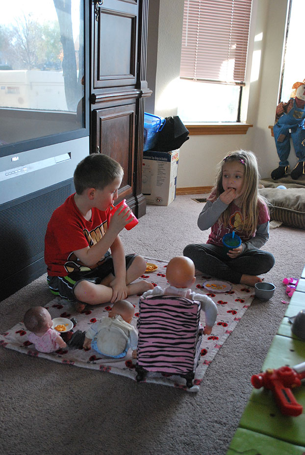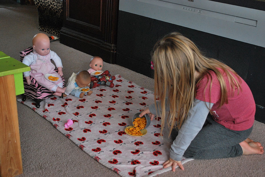 I had been in the shower and when I came out Jaelee had made a little picnic for her and her dolls on the floor. She laid out her favorite blanky, made a table for one of her dolls and got everyone some gold fish. It was super cute. It wasn’t long before Jayse wanted in on the action.