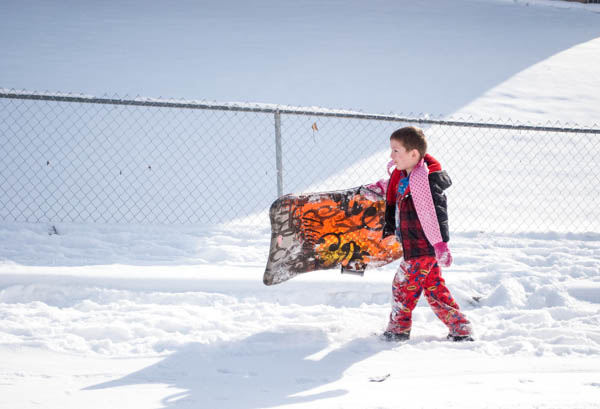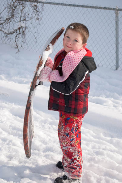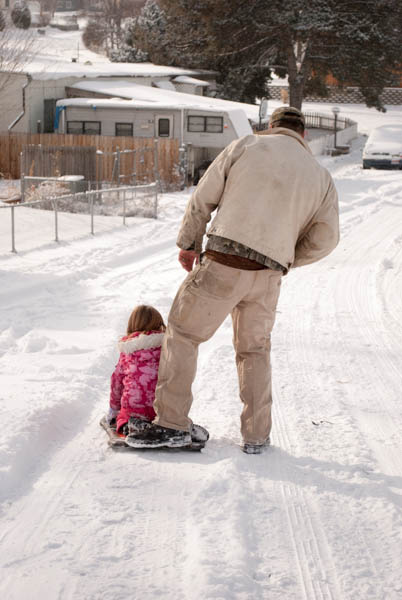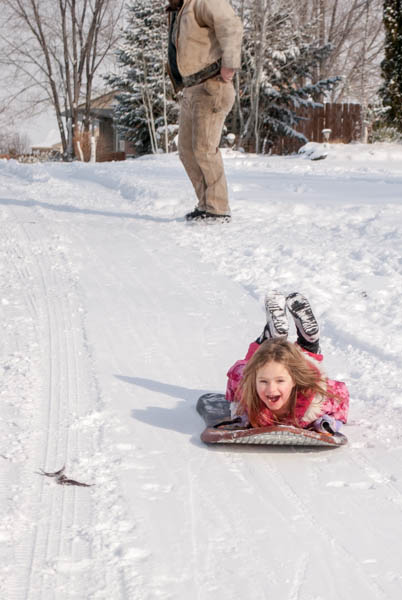 Then her dad went outside and showed her how to sled down the little hill by our house. She had so much fun! After a while Jayse finally made his way out, at first only in his pajamas and then when he saw how much fun Jaelee was having went back in to get more snow gear on for himself. He couldn’t find his gloves so he was using his sisters scarf that has mittens at the end. I thought it was pretty cute of him to find that and use it and not come out whining that he couldn’t find his gloves. He just found the scarf and made it work!