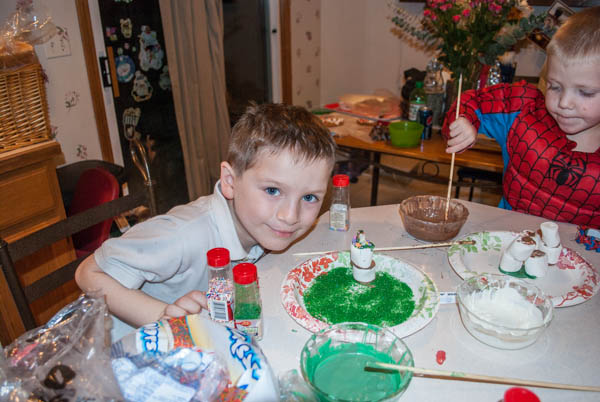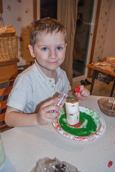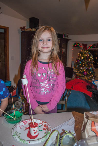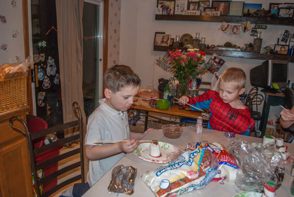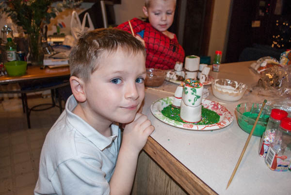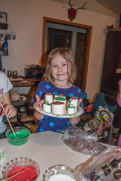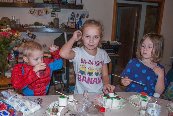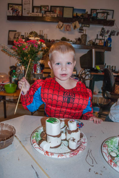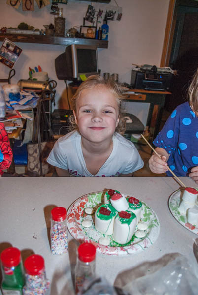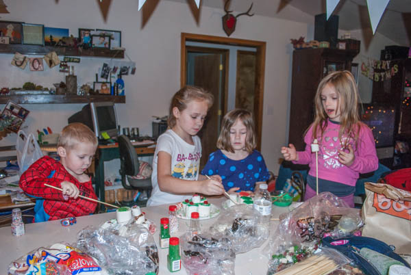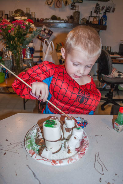 I went to the store earlier in the day and got all kinds of melting chocolate so we could make marshmallow houses and paint them with chocolate and decorate them with candy.
