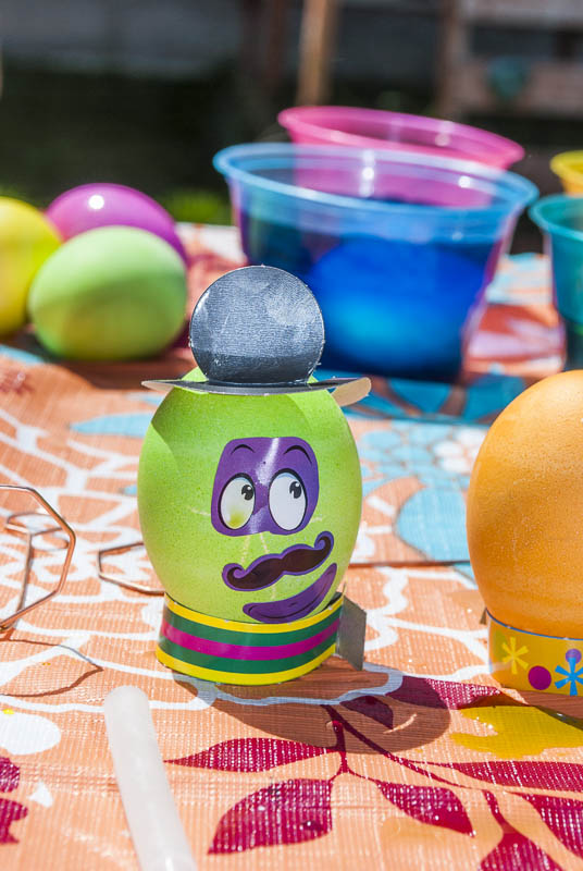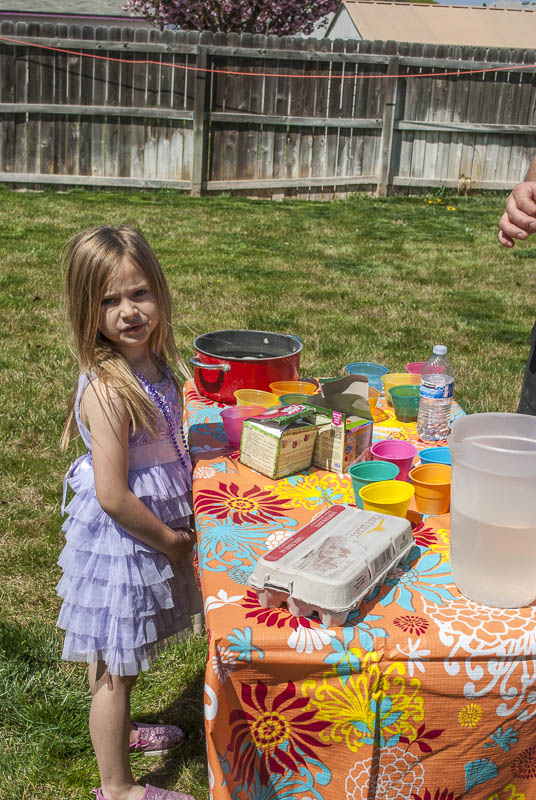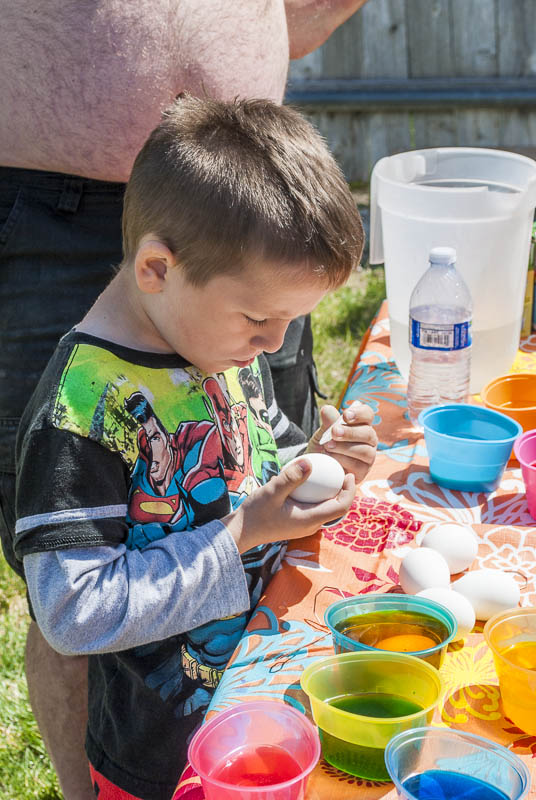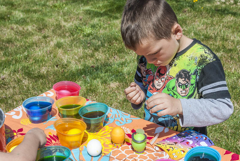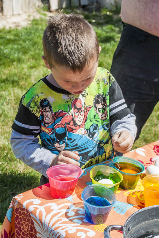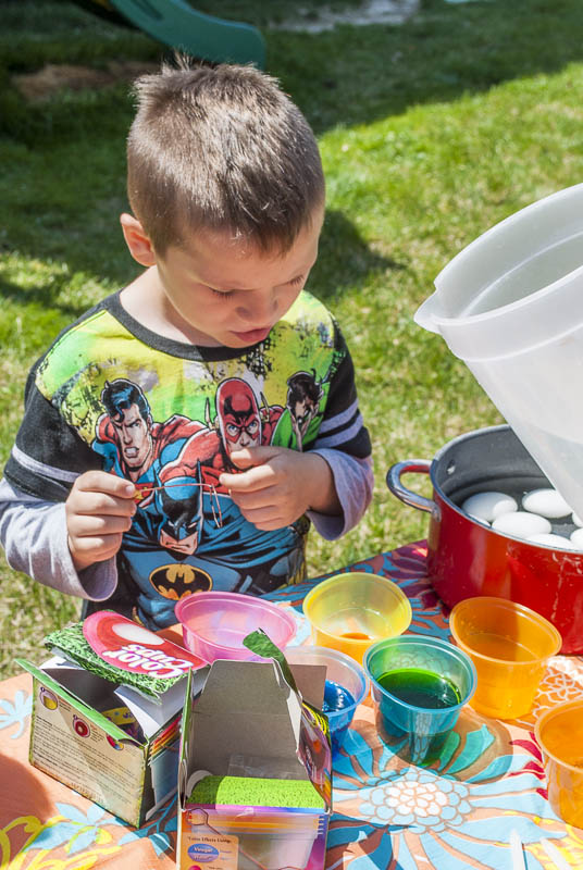 This year the weather was so nice we colored eggs outside. It was awesome! Their was no mess in the house and clean up was easy. The kids had a lot of fun and they made some great eggs!