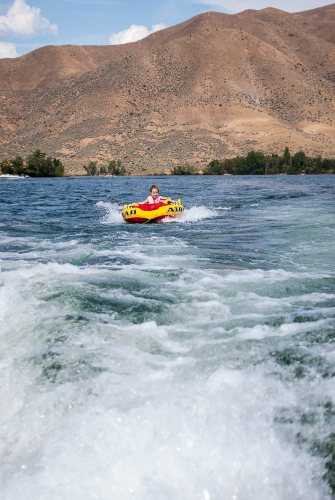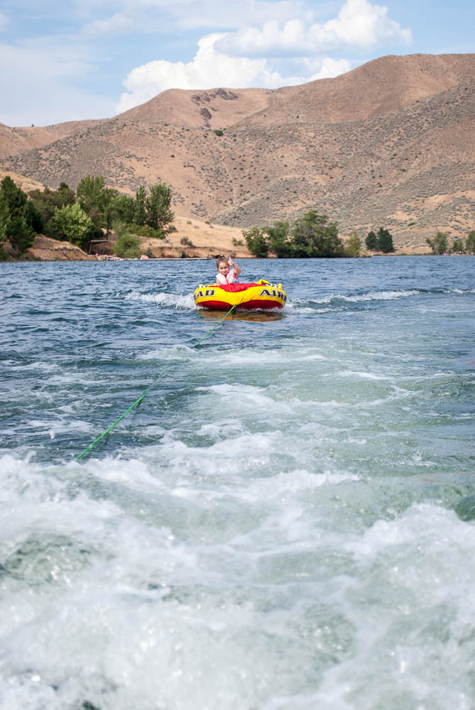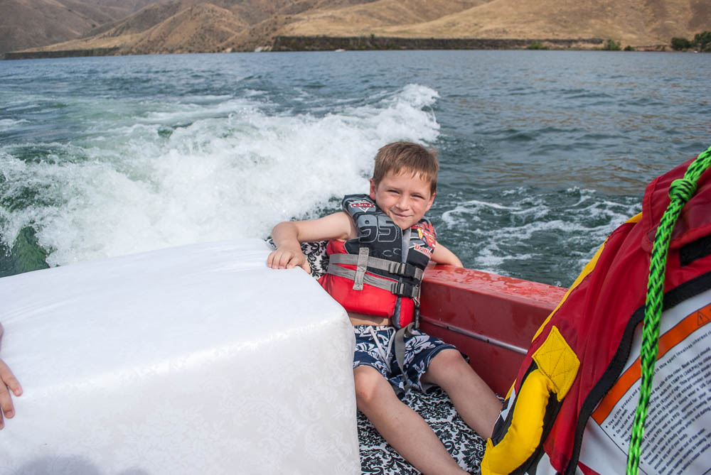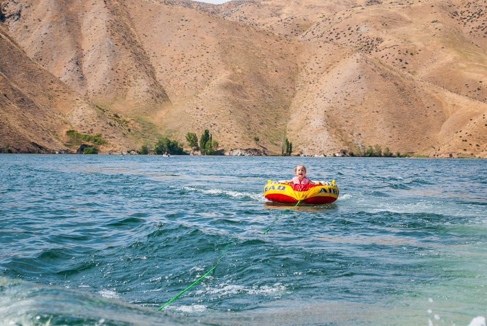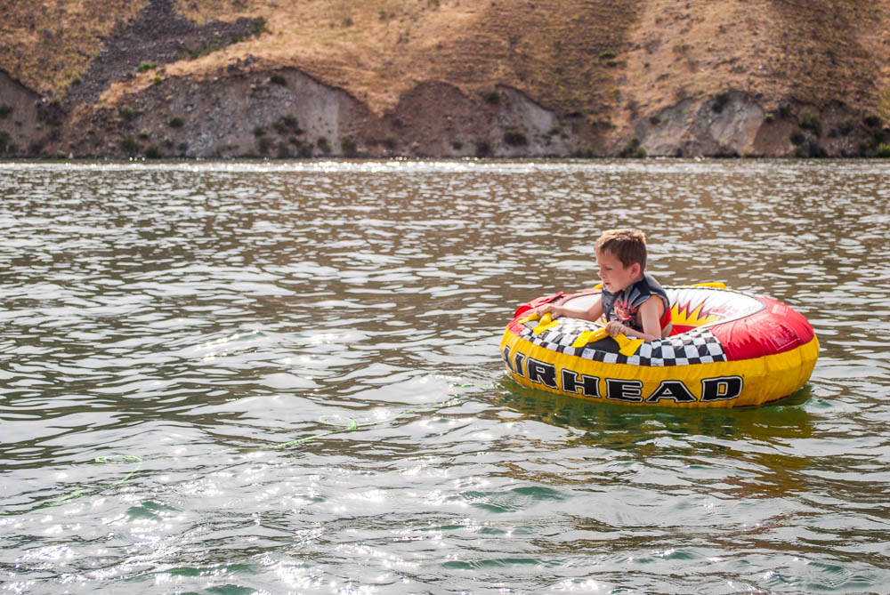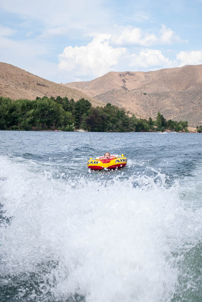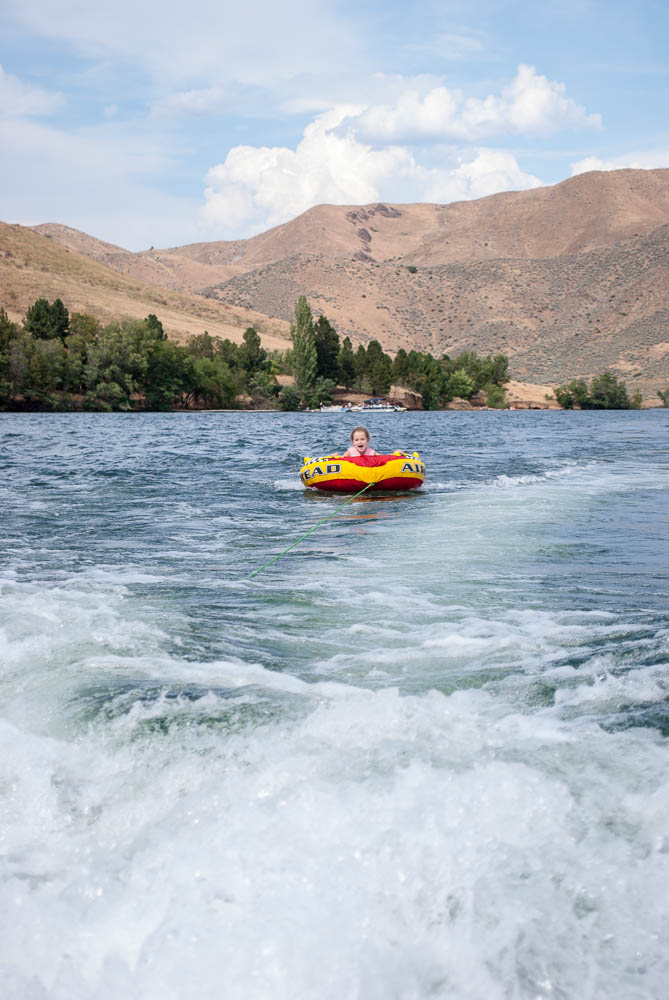 After our test run of the boat Greg did a few tweaks and I was itching to take it out on a real run. We drove up to Lucky Peak to spend the day out there. The boat ran like a champ. We found a dock to spend the day on. We docked the boat for a bit, swam around, ate lunch and then rode the tube. The kids had never done that before so I went first. I couldn’t get my fat butt in the tube to sit so I laid down on it. Greg pulled me around on my stomach. I was wiped all over the place with my legs flying in the air. Just when I thought I couldn’t hold on much longer Greg stopped the boat. My arms were dead. It was a struggle to get back in the boat but it was fun.