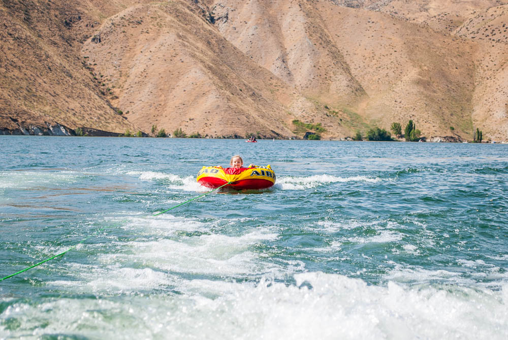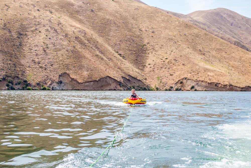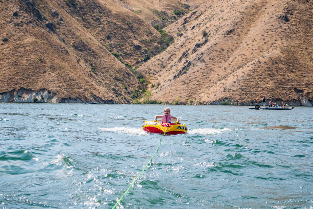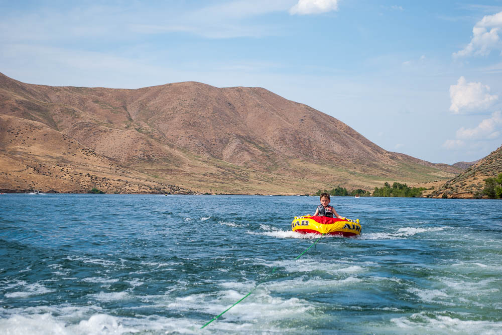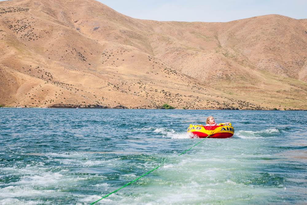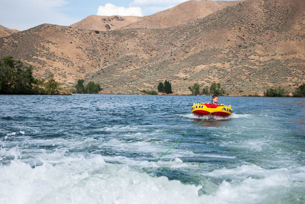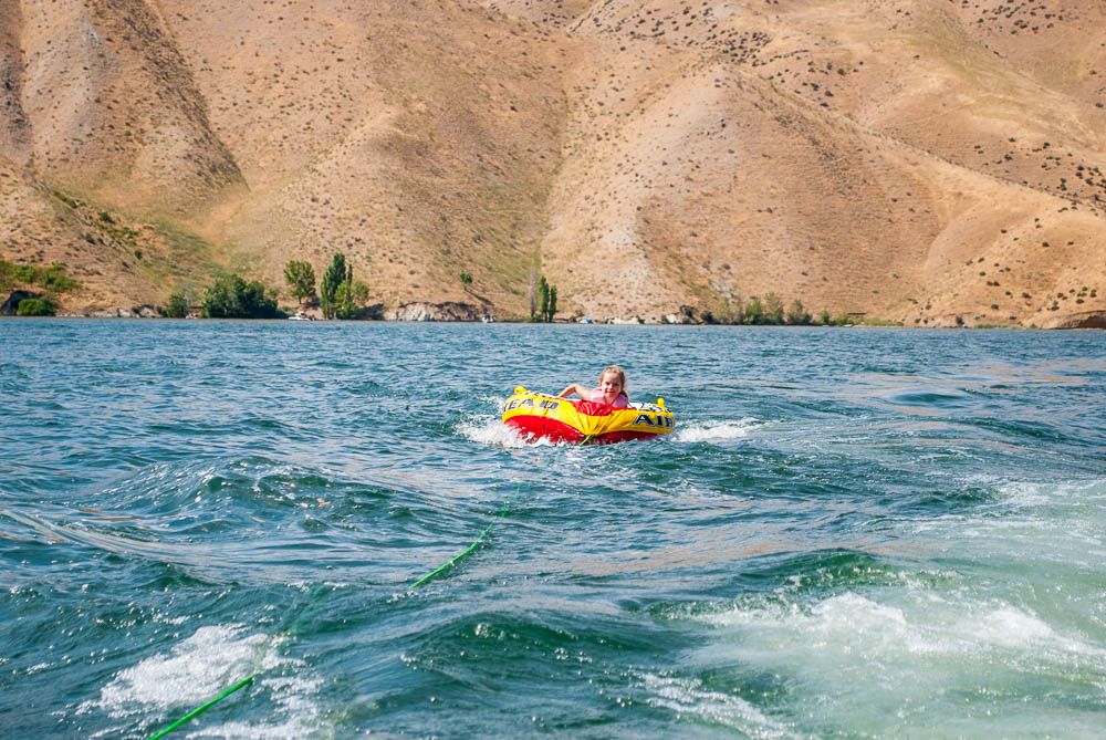 After our test run of the boat Greg did a few tweaks and I was itching to take it out on a real run. We drove up to Lucky Peak to spend the day out there. The boat ran like a champ. We found a dock to spend the day on. We docked the boat for a bit, swam around, ate lunch and then rode the tube. The kids had never done that before so I went first. I couldn’t get my fat butt in the tube to sit so I laid down on it. Greg pulled me around on my stomach. I was wiped all over the place with my legs flying in the air. Just when I thought I couldn’t hold on much longer Greg stopped the boat. My arms were dead. It was a struggle to get back in the boat but it was fun.