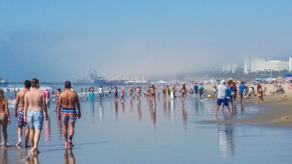 After breakfast I walked around the pier and took pictures. I had planned to walk to Venice Beach from the pier. I had google mapped it and saw it was only a couple of miles. I talked to a hostess at Bubba Gump that was super friendly and she told me it was a nice easy walk. I headed out along the boardwalk. It was really neat to see the ocean along my walk and all the interesting people. I saw a lot of people on bikes and rollar blades. I eventually made it to the Venice beach boardwalk. Just as I got there fog rolled in covering everything on the boardwalk with a light mist and cooling everything down.