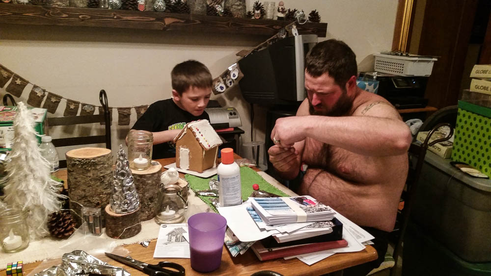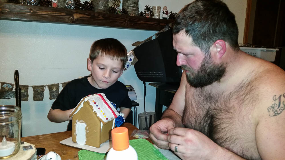 This year in our advent calender I added activities for every day for the 25 days of Christmas. They were for all kinds of things from call a loved one to going to see lights. One of them was to make gingerbread houses. We bought the kits and worked in teams to make them – boys against girls.