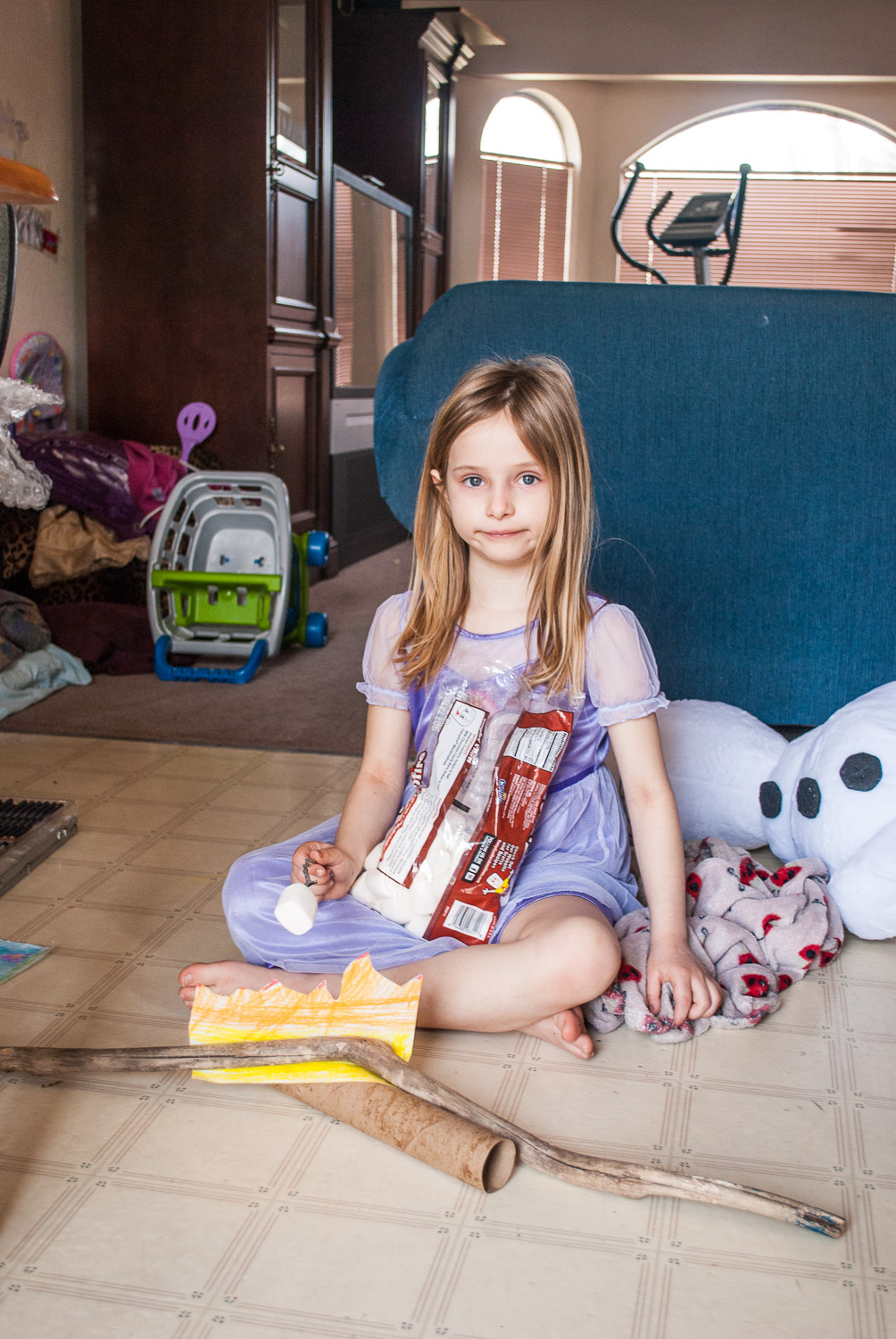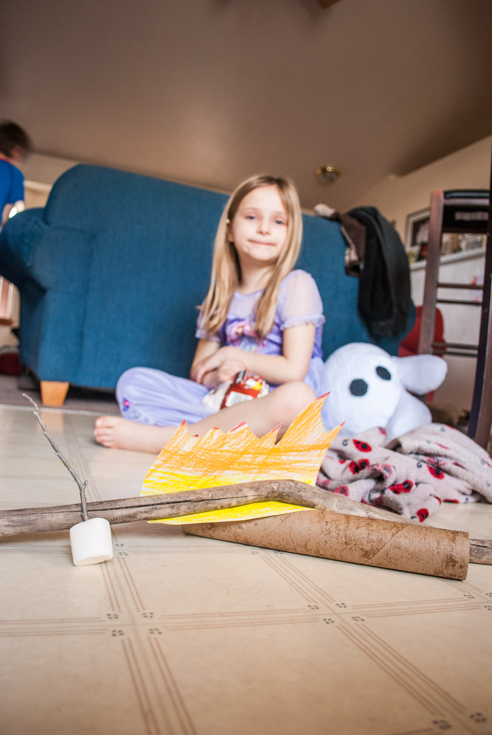 The day after their surgery the kids were still running around like crazy. I was so surprised. It seemed things were going to go so smooth. I was busy doing something and Jaelee came and asked me for marshmallows for her fire. Usually that means trouble because they have actually tried to start a fire before. So I quickly came to see what she was doing. I found she had made a fire but this time she drew the flame on paper and taped it to a stick and a paper towel roll. It was so inventive. I was very proud of her fire and had to get pictures of it.