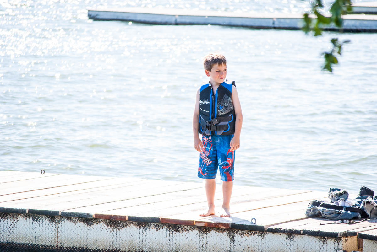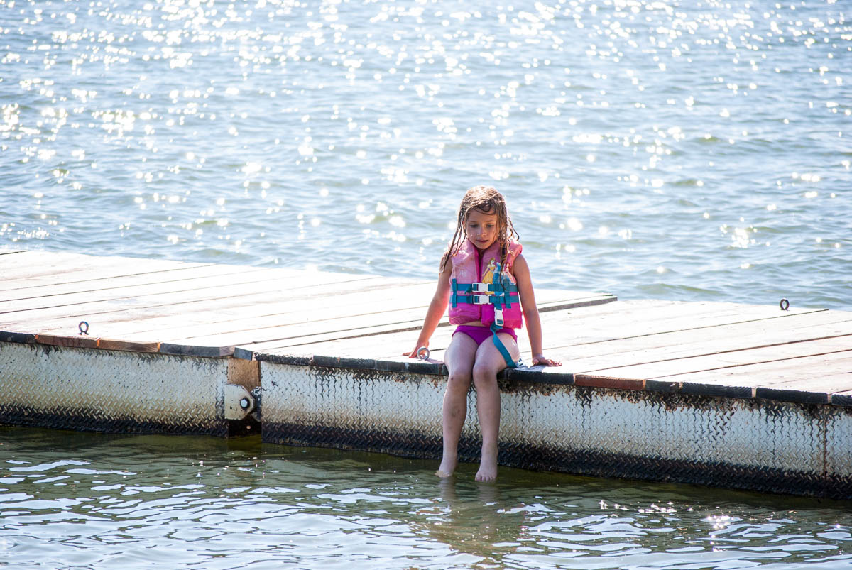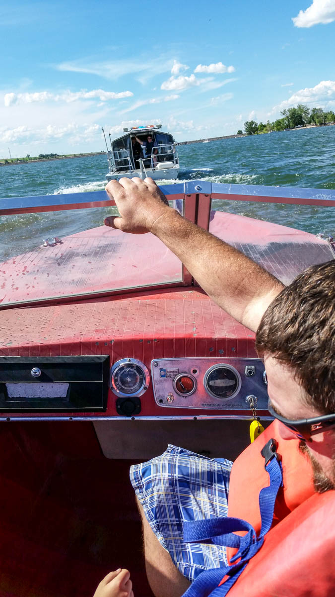 Knowing this might be our only chance to take the boat out I was still determined to go so we loaded the boat and headed to the lake. We finally arrived got the boat in the water and started it up to head out. We slowly pulled out and made it passed the buoys and Greg hit it to speed away and all the sudden a huge amount of smoke started coming out of the engine. I thought we caught on fire so I started yelling fire fire! I moved the kids away from the back and Greg shut the engine off. It turns out that some piece came out and the exhaust was coming into the boat instead of out. We were not able to start the boat again so Greg grabbed the paddle and attempted to paddle us back. However with one paddle and the wind we were going no where. Luckily our phones work out there so I was able to call the sheriffs office and they were able to come and tow us back. Our adventure was a quick one! When we got the boat loaded back up we let the kids play in the water for a little bit and then headed home.