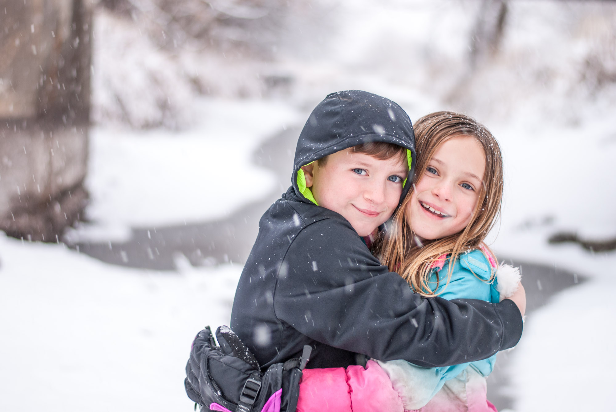 It snowed all day yesterday. I was able to pick the kids up at school and get home a bit earlier then normal. We went to this canal by our house that I keep driving by thinking it would make a nice background in photos. We had to hike down it in snow, my buns got poked a few times by some prickly bushes but we made it down.