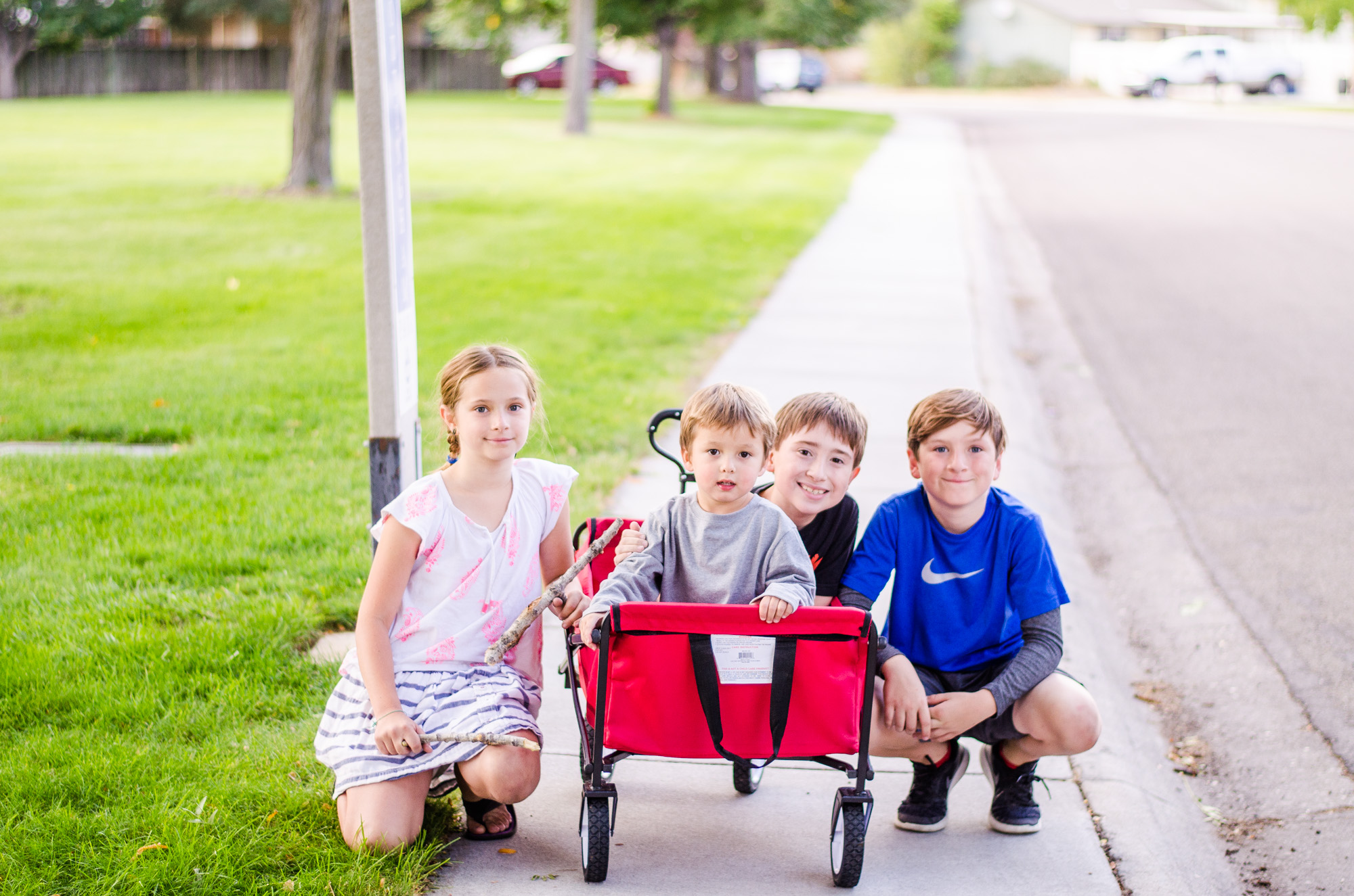 The weekend of the kids second games Jenelle and Elijah drove up for a visit. We love when they come up for a visit. After the kids games a neighbor friend of the kids came over and they all played on the trampoline for a while. When that got old they all went to the park down the street. The kids pulled Elijah there in our wagon.