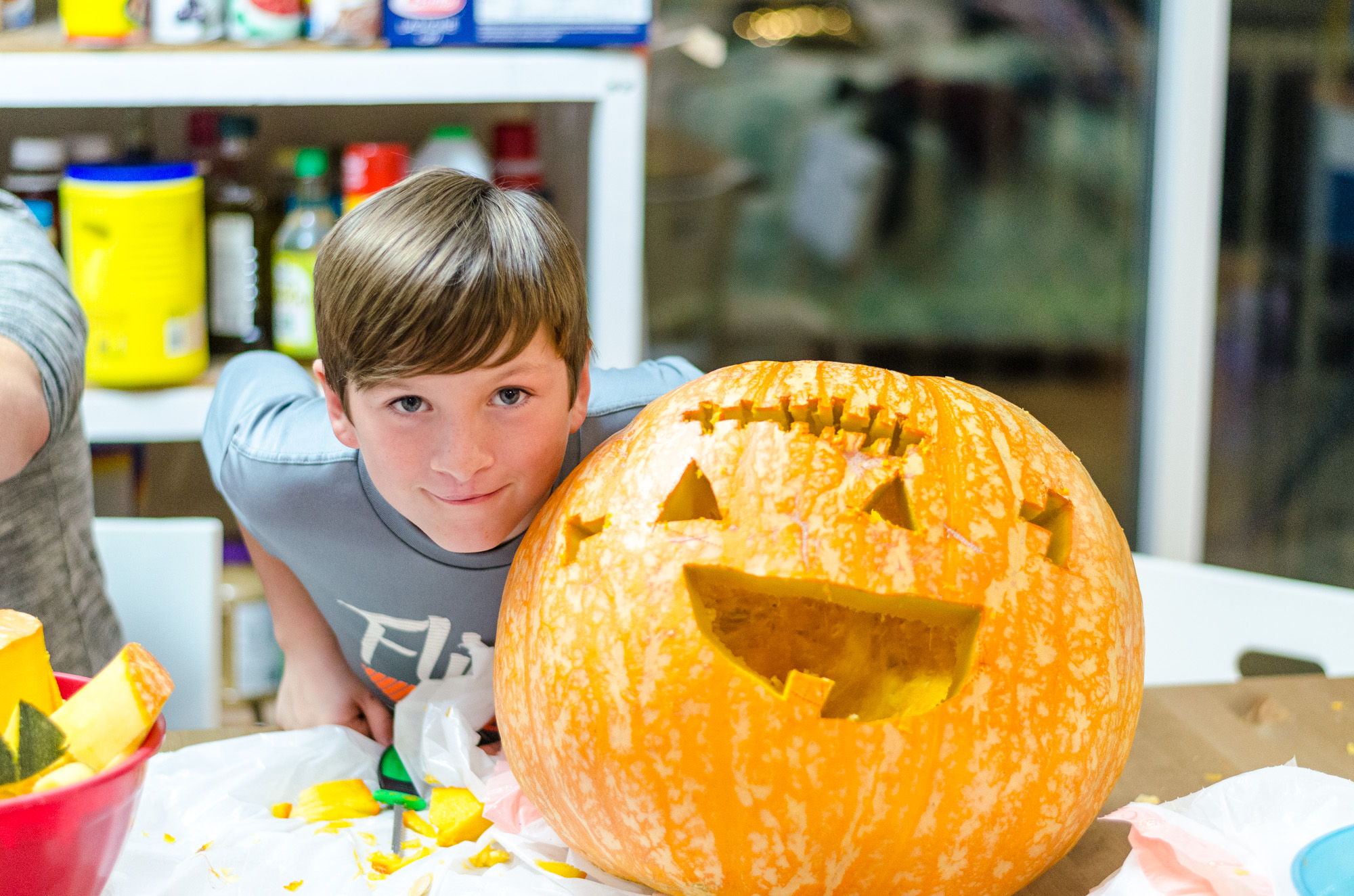 Greg had grown a few large pumpkins that we decided to carve. I went to the grocery store and got a few more for us to carve. Like I mentioned earlier we had been super busy and we weren’t able to carve our pumpkins until the day before Halloween. It was also a school night so we all just did some simple traditional jack-o-lantern faces. The large pumpkins of Greg’s him and Jayse decided to take on. They were pretty thick and it took some time just to get the tops off. They managed it though and made some great pumpkins. While we carved we watched Hocus Pocus and the kids loved it. One of my favorites for sure.