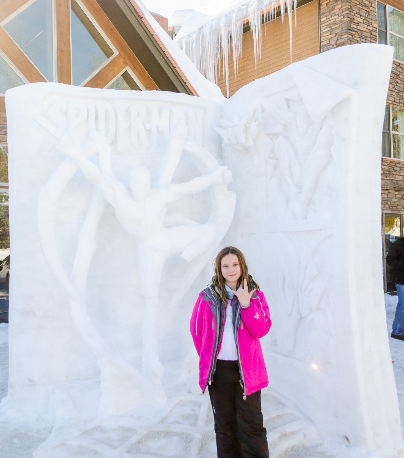 Before we headed home we played outside in the snow again for a bit, then we went and looked at the sculptures. The theme of the carnival this year was Super Heros and legends so it was fun to see some of the hero sculptures. Jaelee is obsessed with Spiderman right now and they had a really great sculpture for Spiderman. Because of the government shutdown going on at the time there were far less sculptures than normal which was a bummer. The ones we did get to see though were really cool.