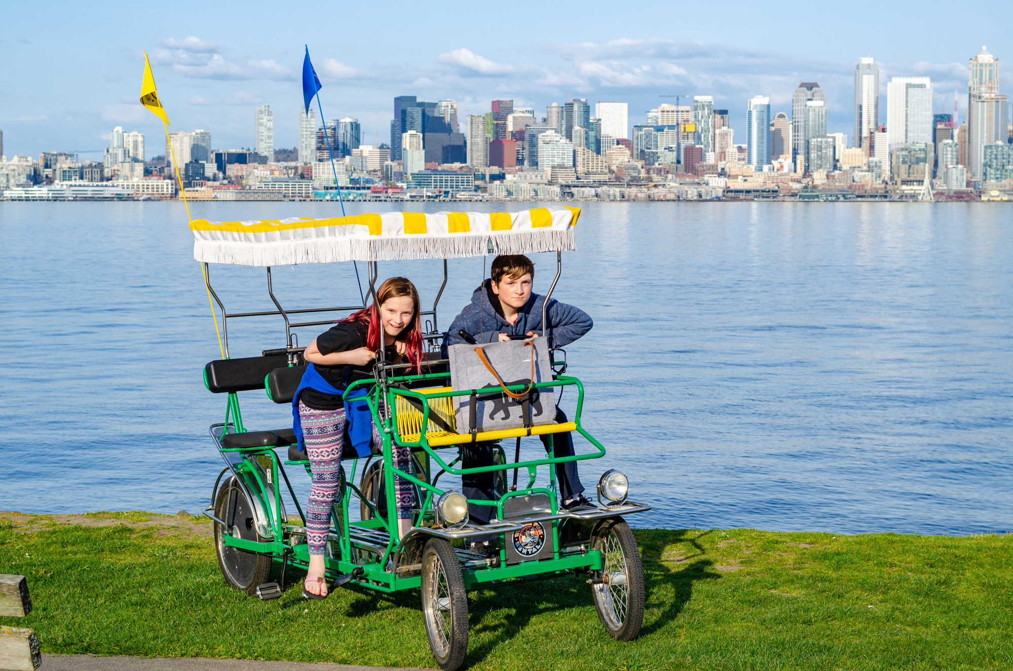 We had a lot of fun on the bike. It was a bike that 4 people could petal and 1 person steered. I started out steering but Jayse was begging to get to drive so we swapped places. I was a nervous wreck, there were a lot of people out and I kept thinking he was going to run into someone. He didn’t but I was still nervous. After a while Jaelee wanted to drive. She was a bit better at steering but still made me nervous. We rode the bike back around to where you can see the Seattle skyline and back. Jayse said the bike ride was his favorite part thing we did in Seattle.