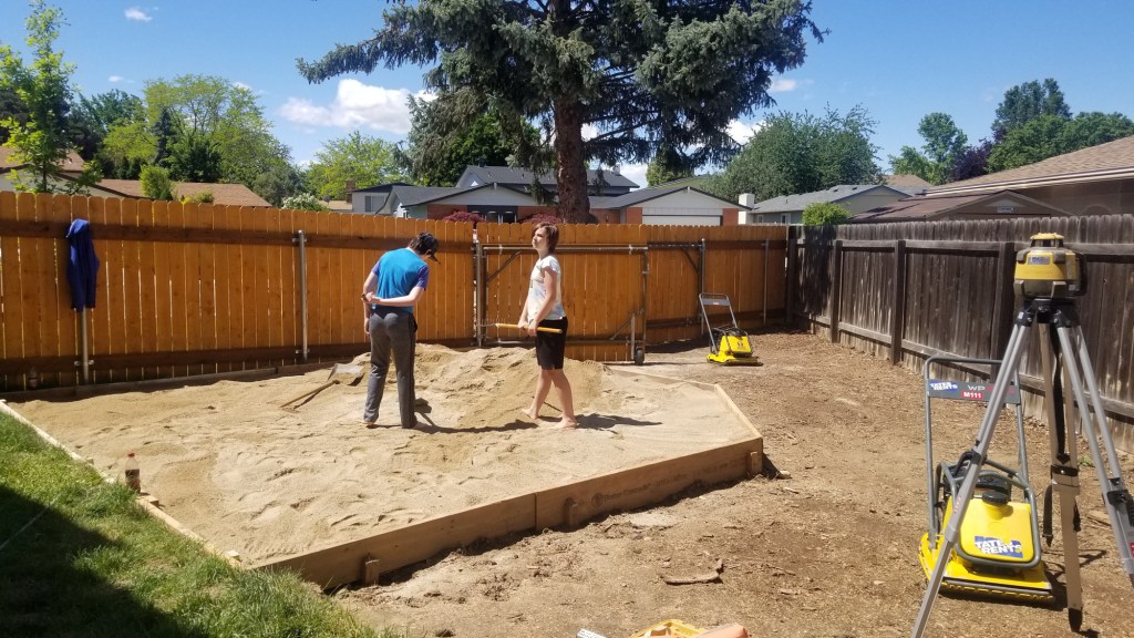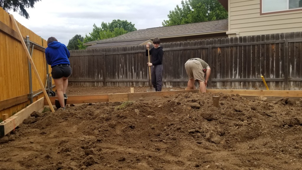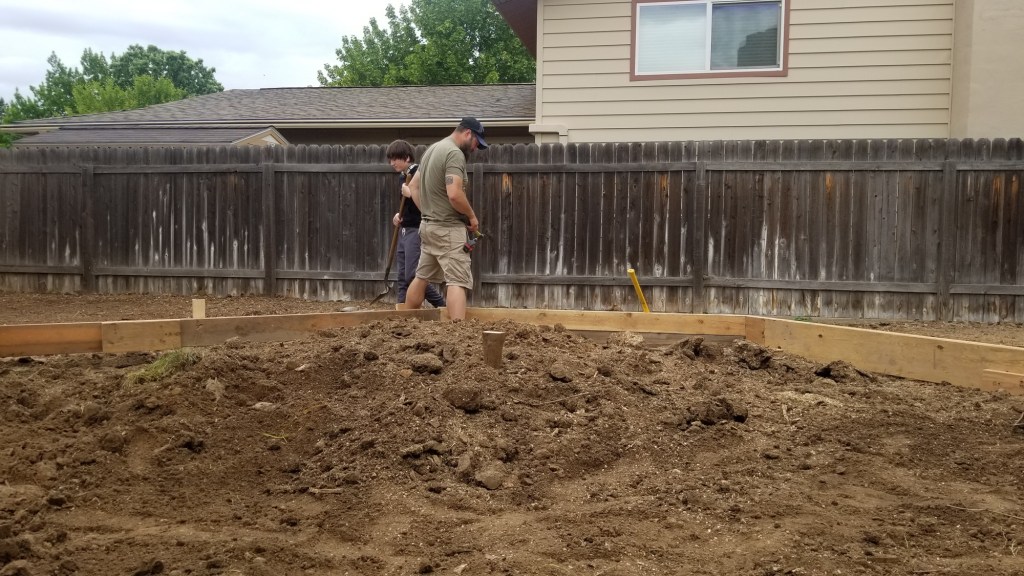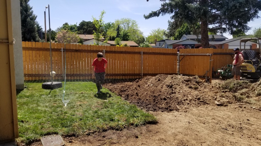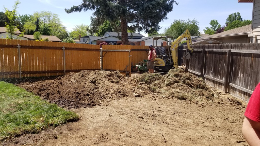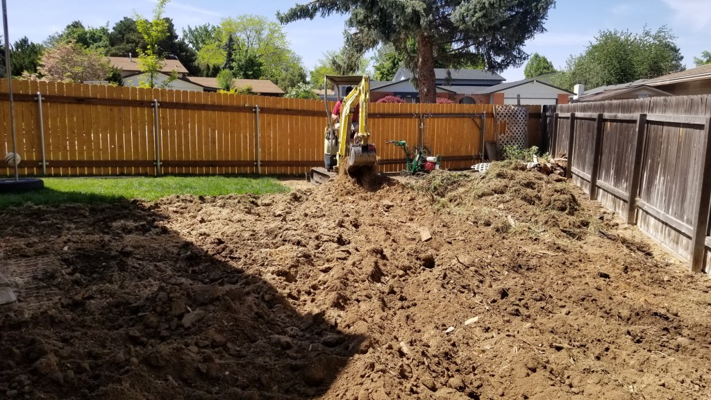 We ended up digging up way more dirt then we planned on. Luckily Greg brought this little excavator home. We dug up so much dirt and then had to move it and rake it all back.