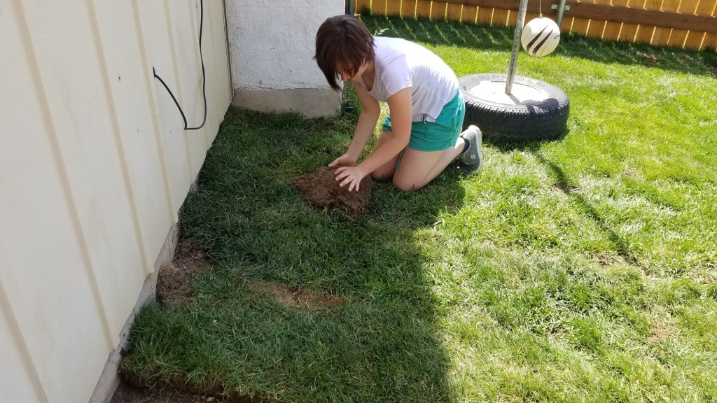 The kids making a straight edge on the grass so we can create a box to put sand in.