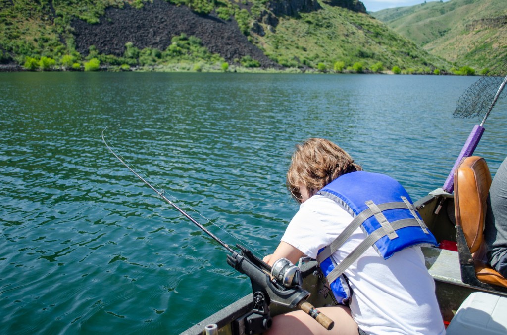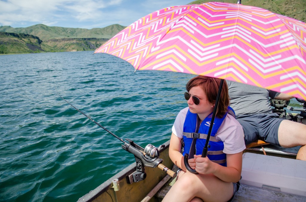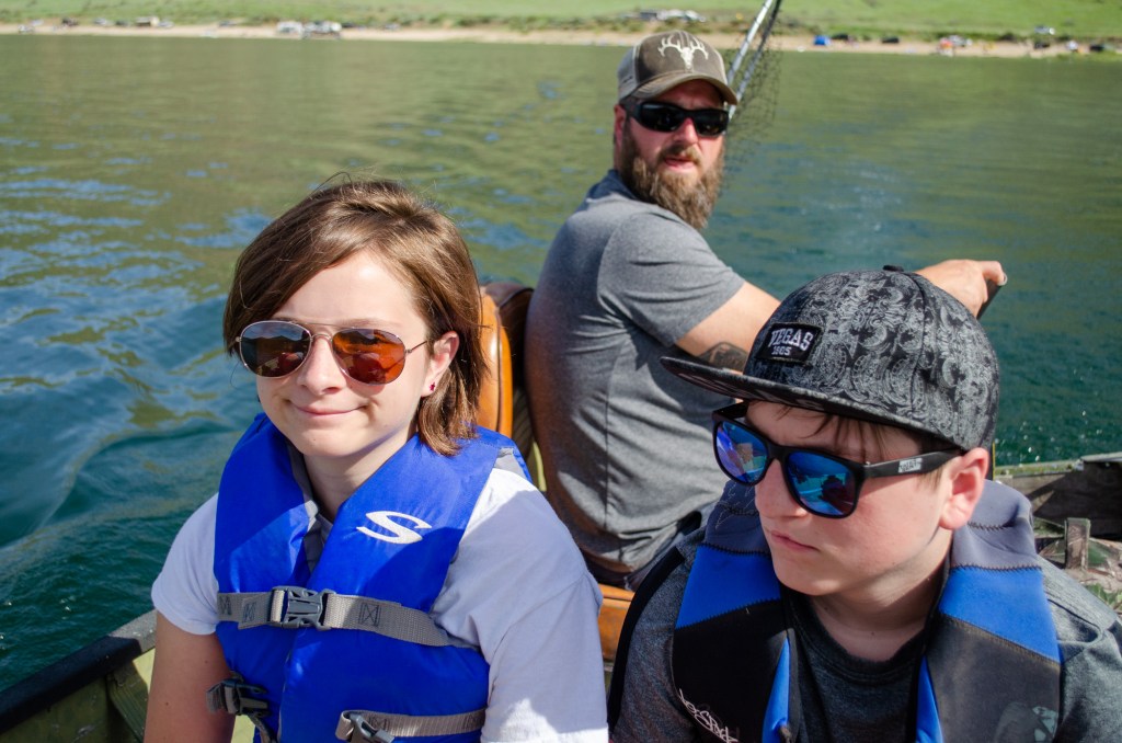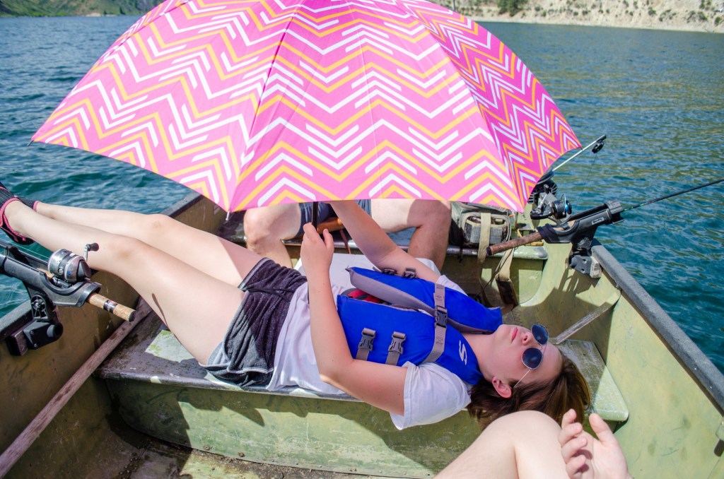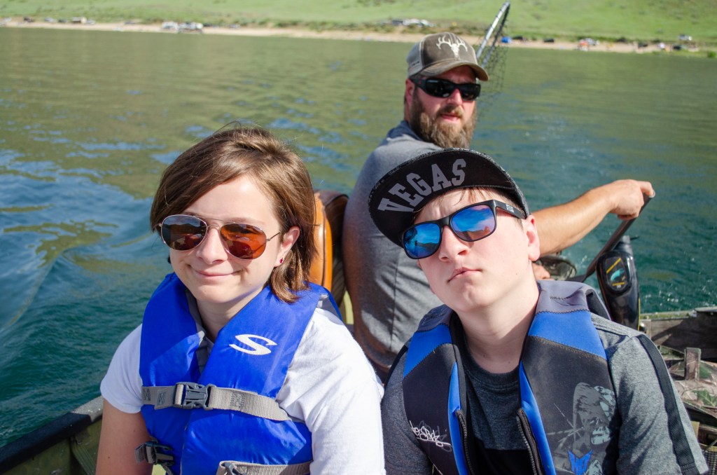 It did turn out to be a really nice day. I sat perched up on a chair at the front of the boat reading. The kids and Greg trolled along fishing. We stopped after a few hours and had a nice picnic on the bank of the reservoir.