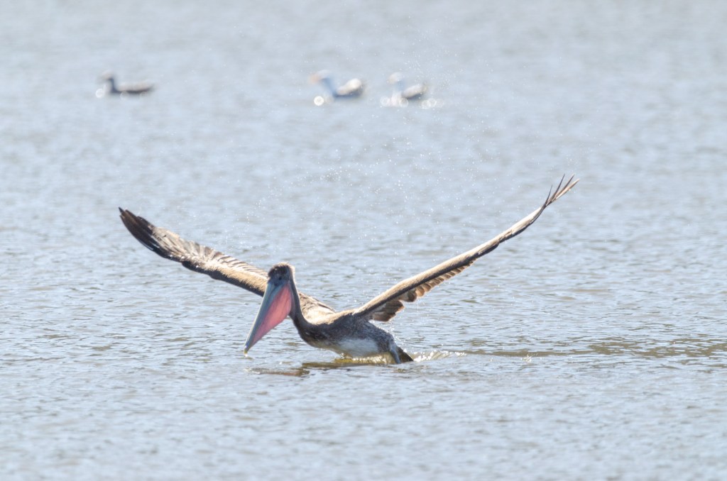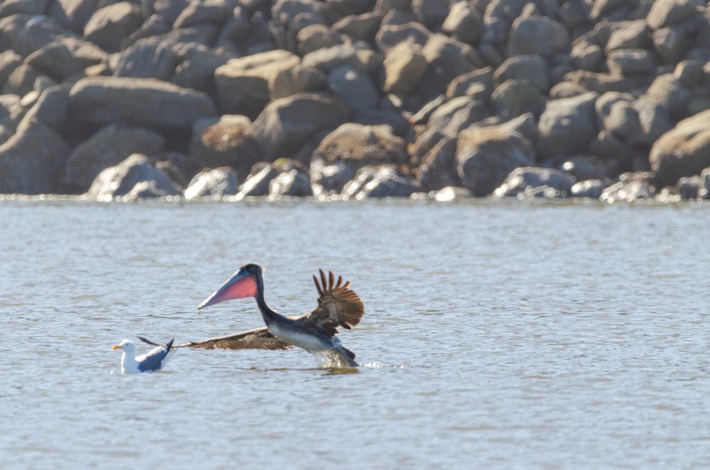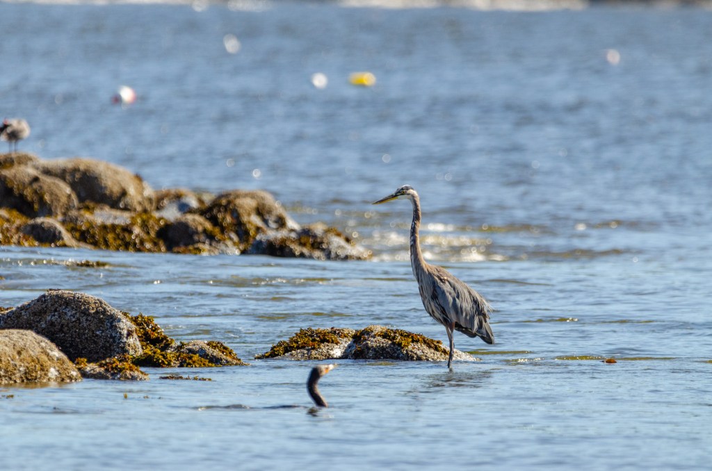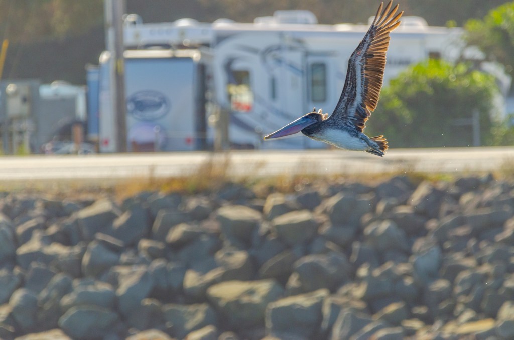 My friend let me borrow a few of his lenses. One he let me borrow was a 600 mm. This thing was huge and heavy. It was so heavy he let me bring his monopod to help steady it. I was lucky that when I got to the beach there was a pelican and a blue heron. I love to take pictures of birds. I used the lens my friend let me borrow and if I knew how to steady that thing I could of got some great photos of the pelican. I got some photos but I don’t think a single one is completely in focus. It was so hard to track the bird with that huge heavy lens. But I’m adding the photos anyway cuz it’s still cool to see.