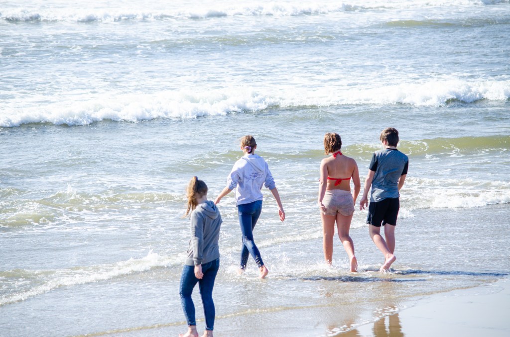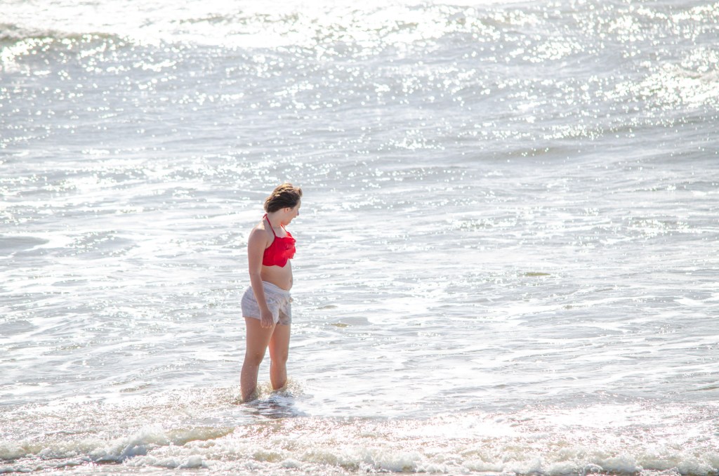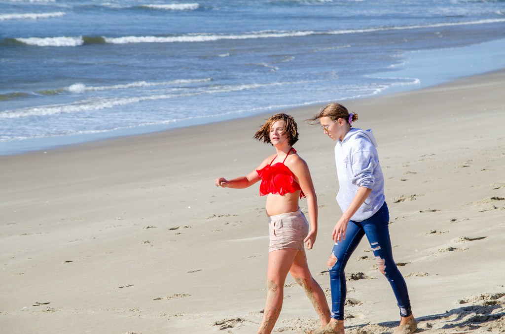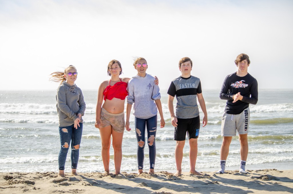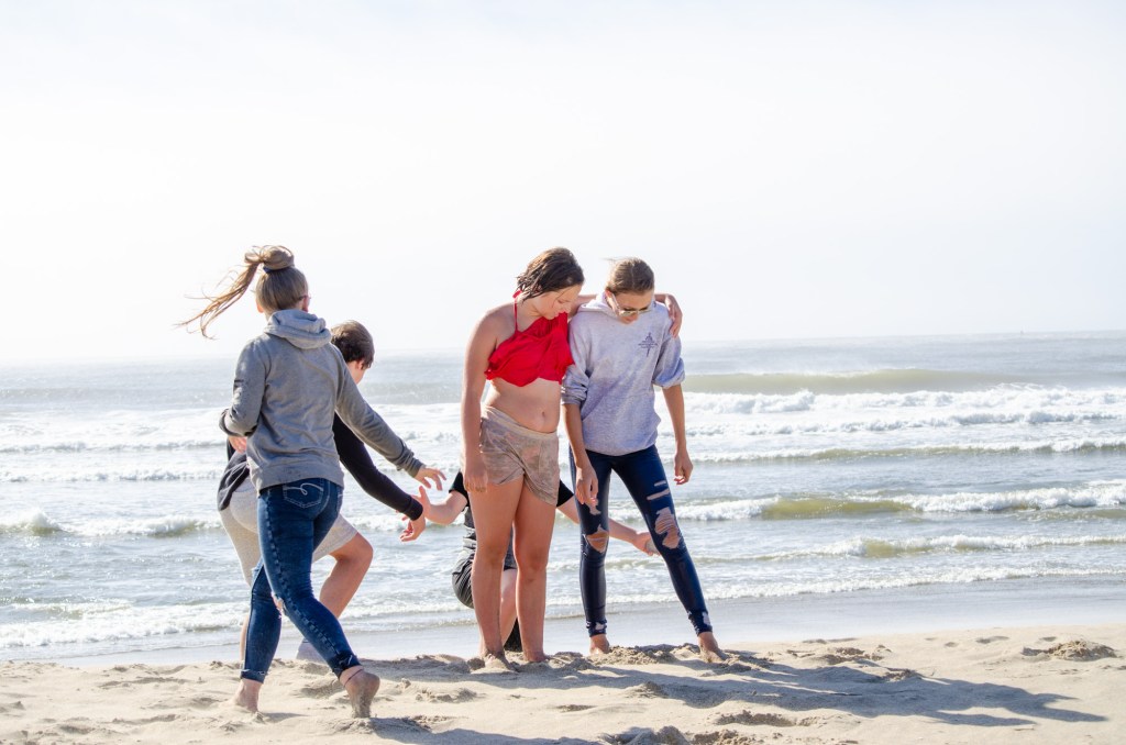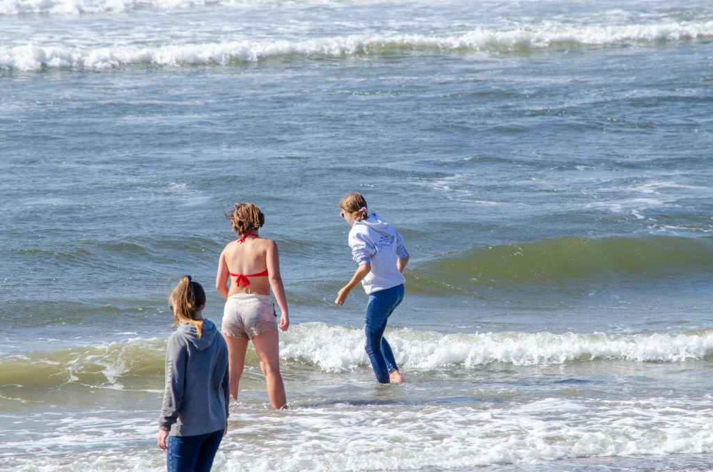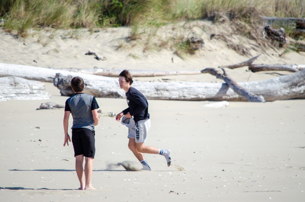 Somehow though Jaelee ended up in her swim suite and getting completely wet. The girls were looking in the water and sand for sand dollars and they found quite a bit. The boys threw a football around and jumped up on sand mounds.