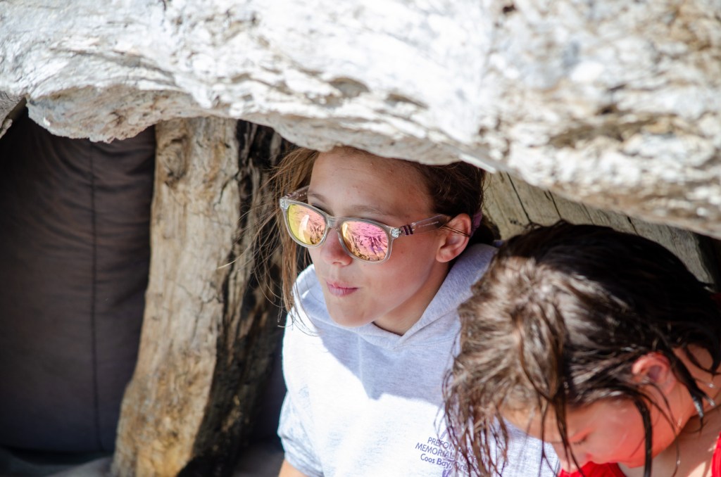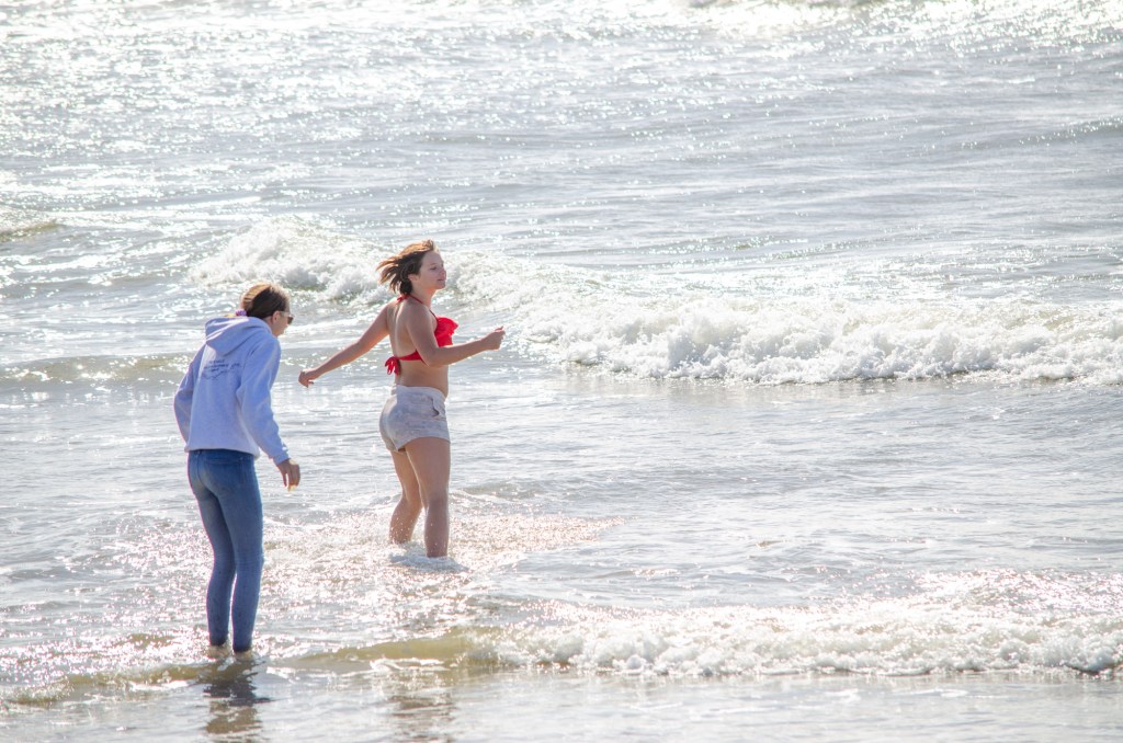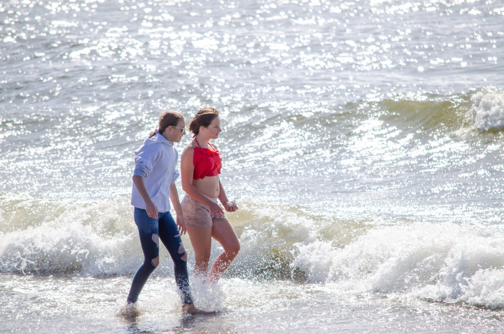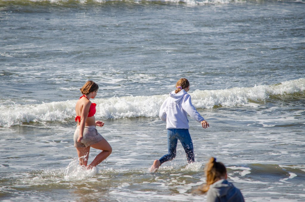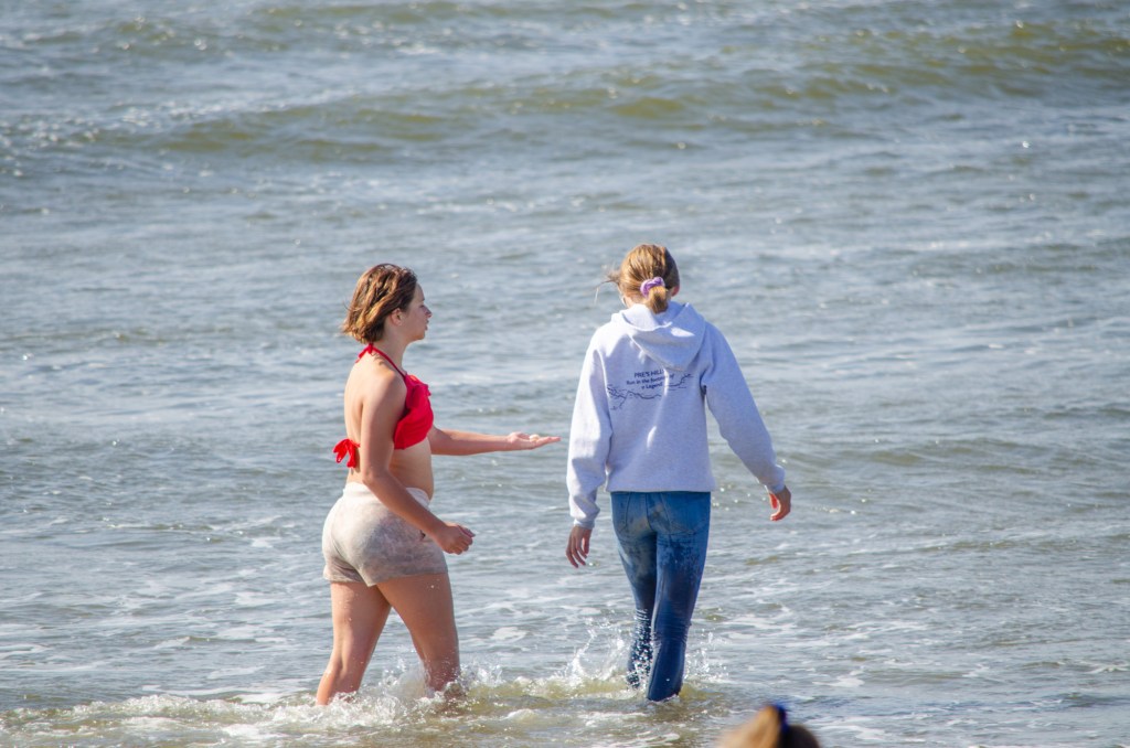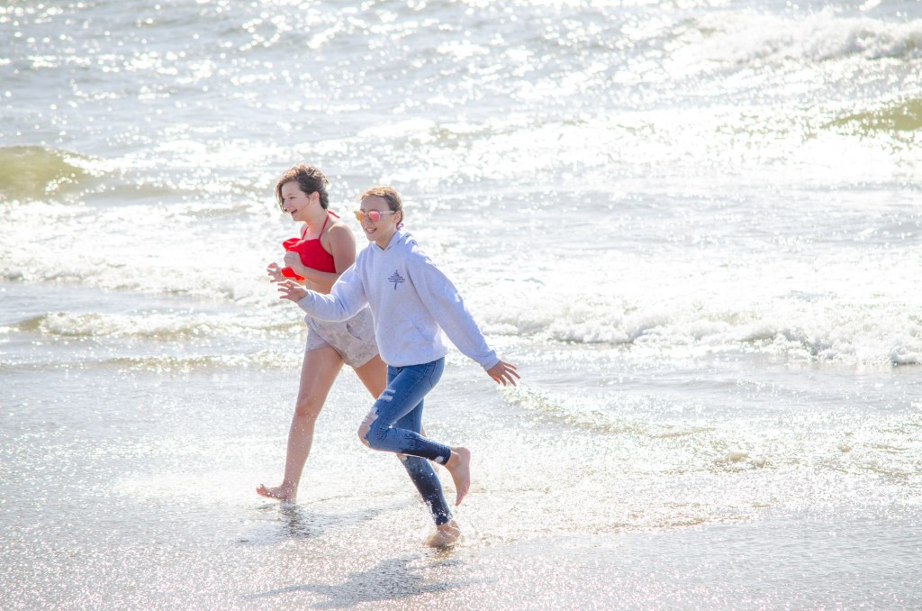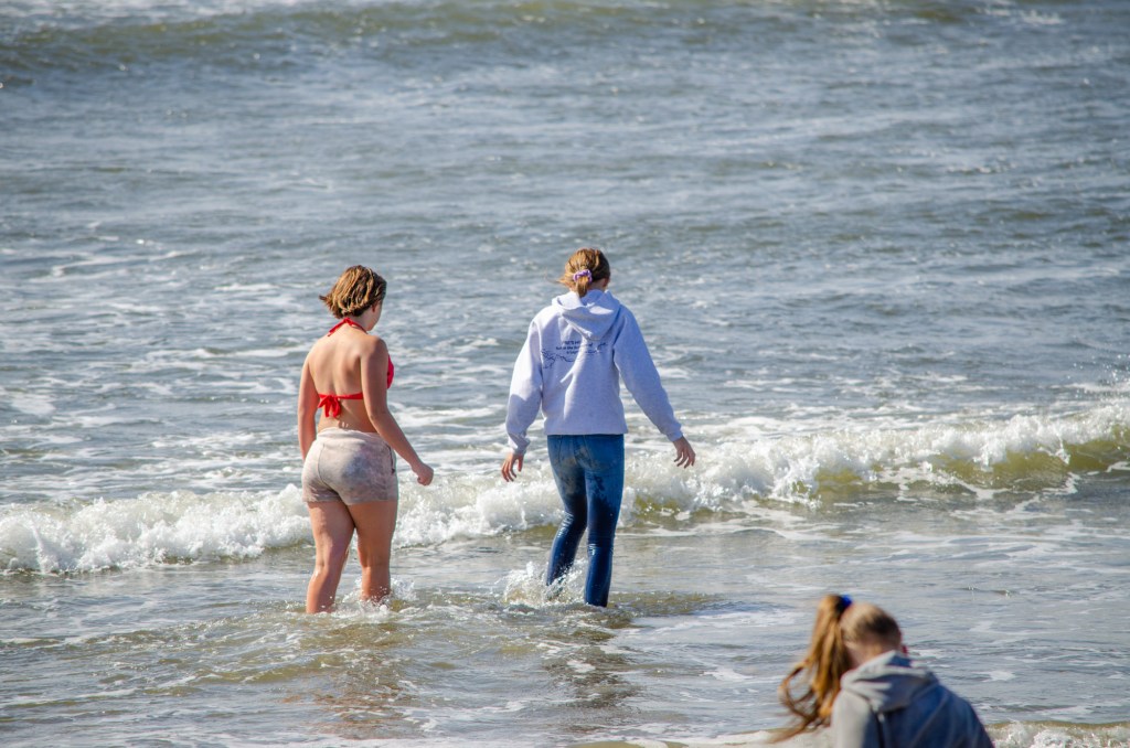 Somehow though Jaelee ended up in her swim suite and getting completely wet. The girls were looking in the water and sand for sand dollars and they found quite a bit. The boys threw a football around and jumped up on sand mounds.