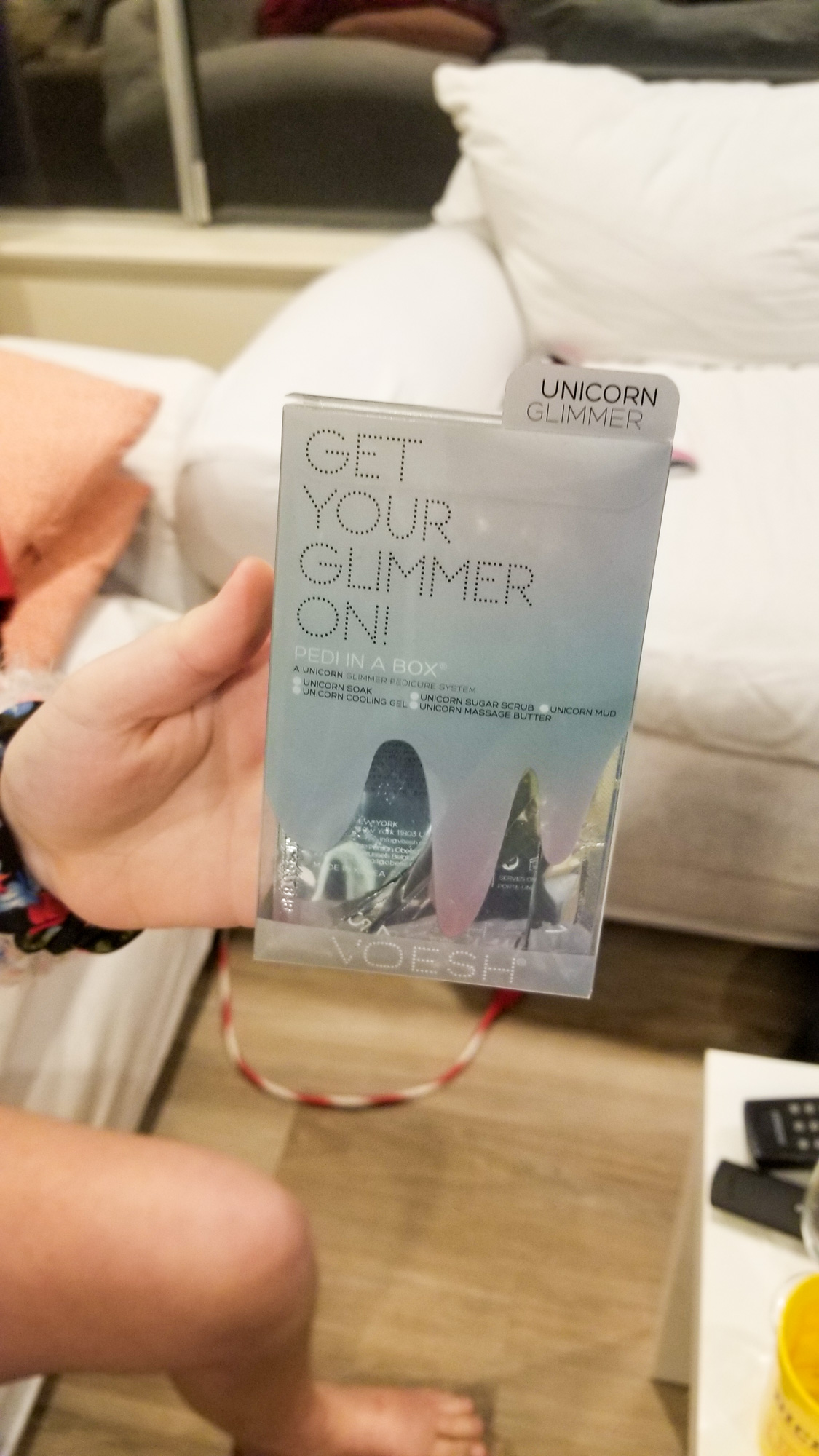 We also got at home pedicure kit in our stockings we couldn’t wait to try. It had 5 different steps to it – stuff to put in the water to soak our feet, mud and scrubs to put on our feet. It was a lot of fun. They were super glittery and made our feet feel really soft. Jayse even got in on the action and tried one too.