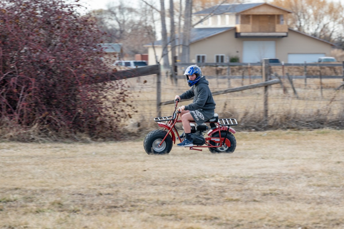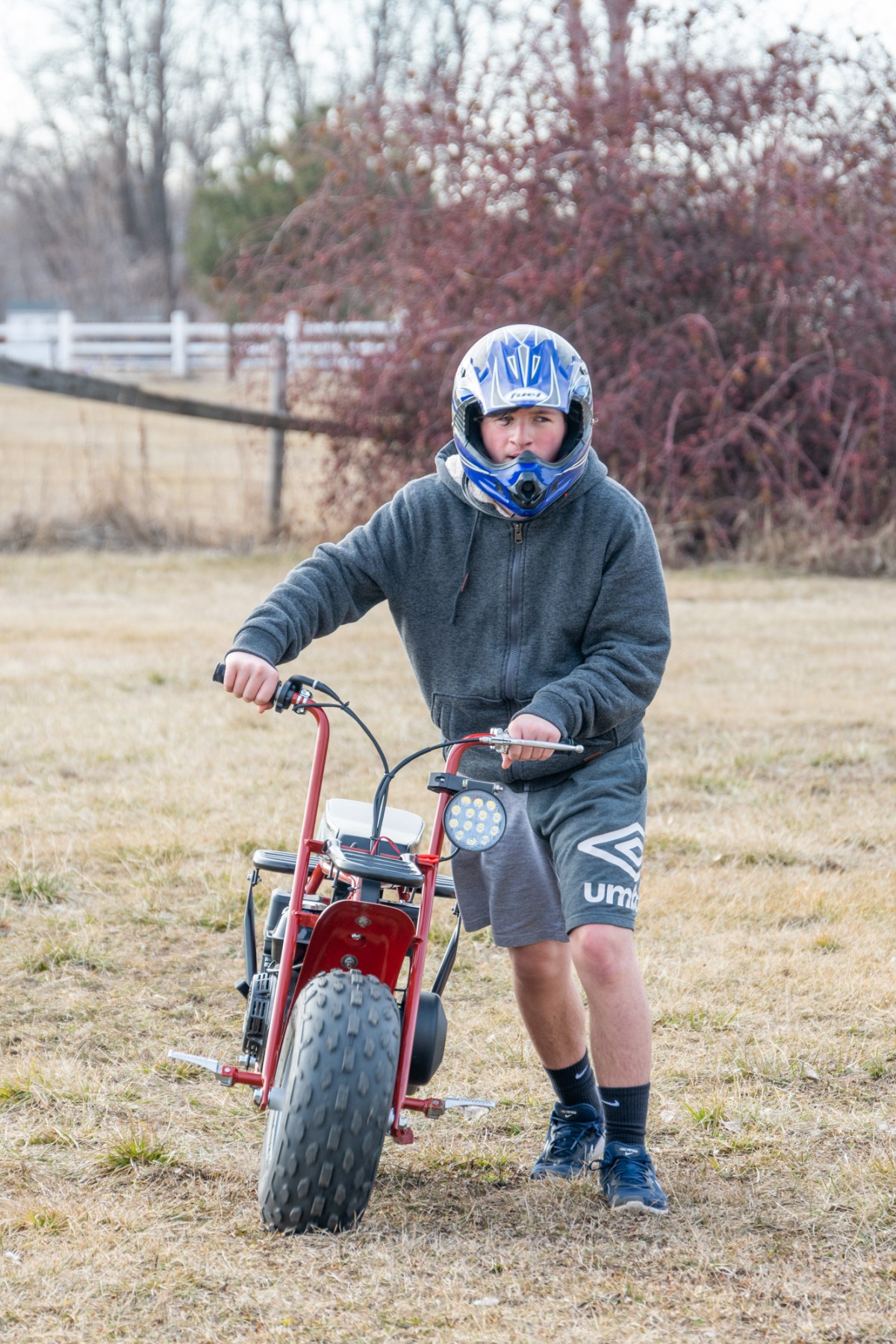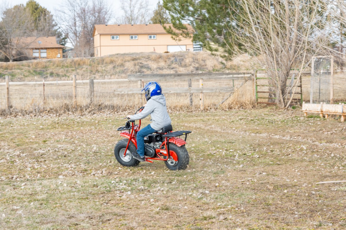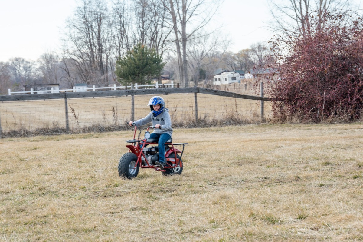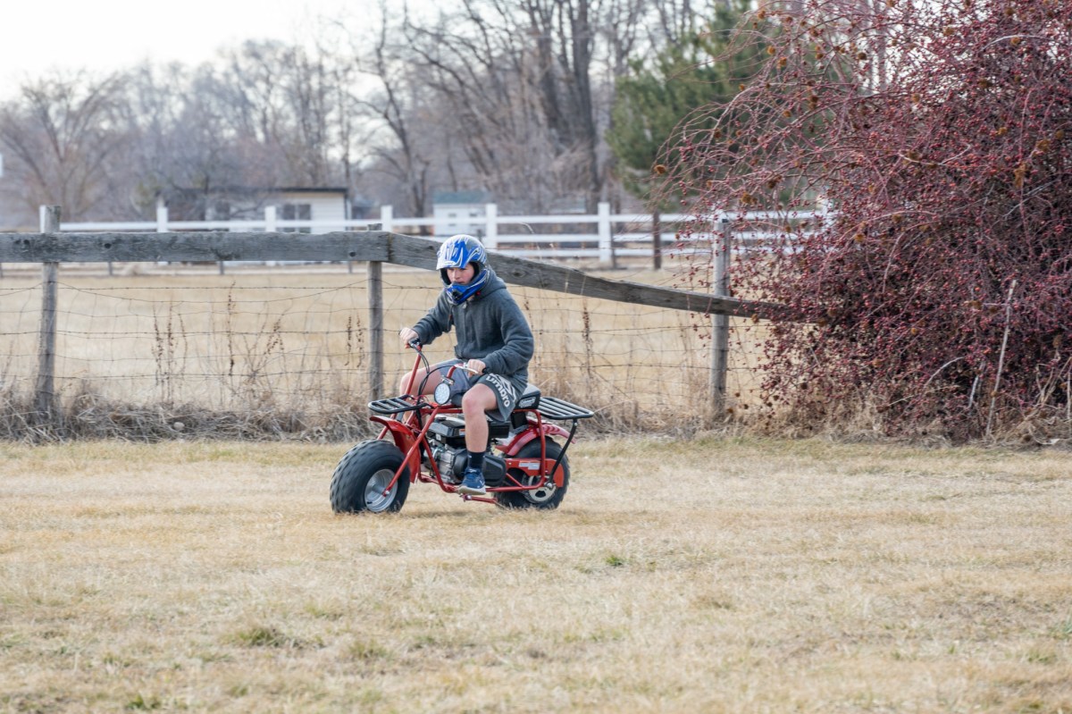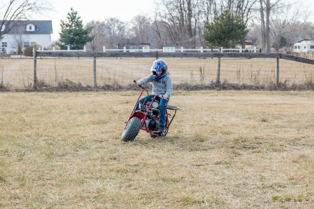 Jayse started the motorcycle when we got there and went full throttle into the dirt bumps and all. He about flew off and hit his knee on the handle bars. He didn’t want to ride too much after that.