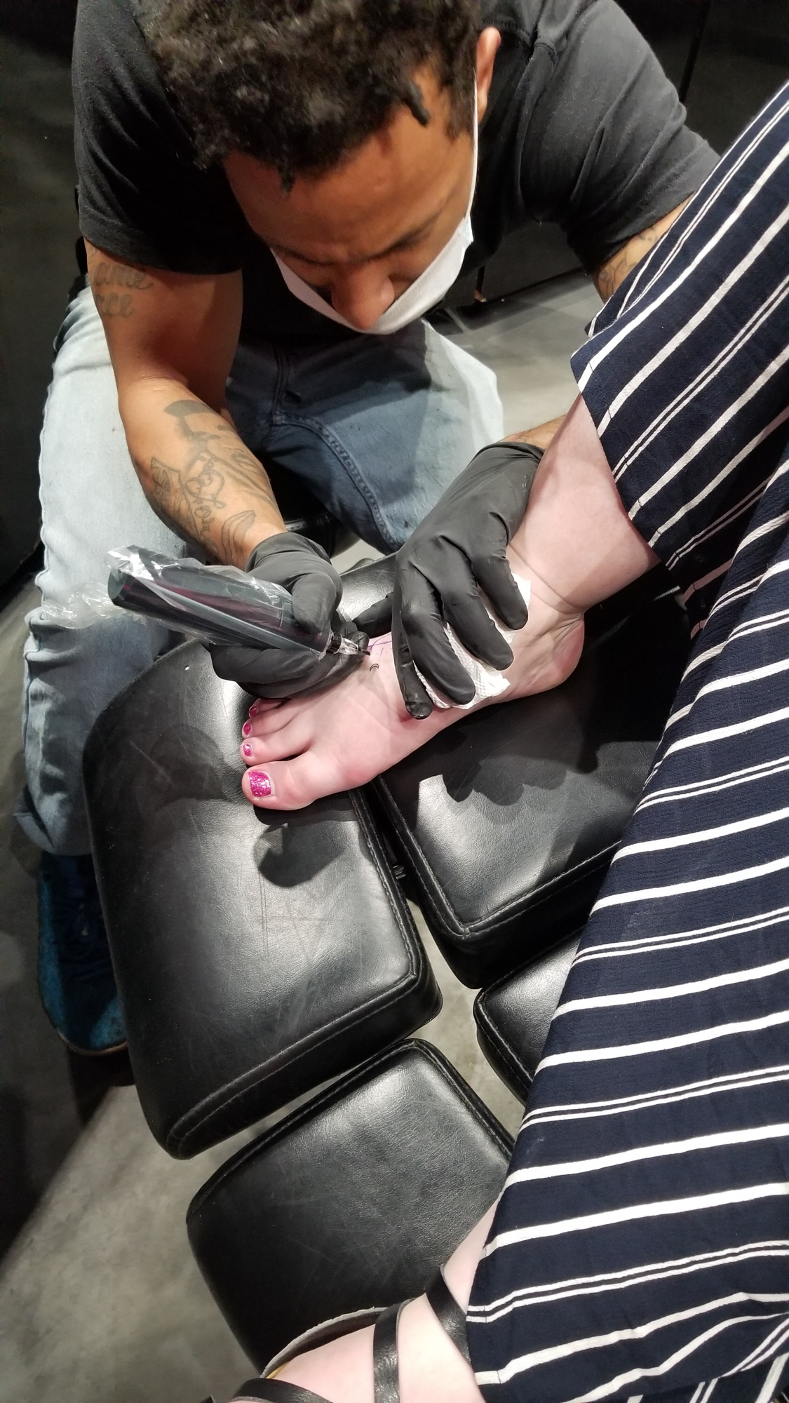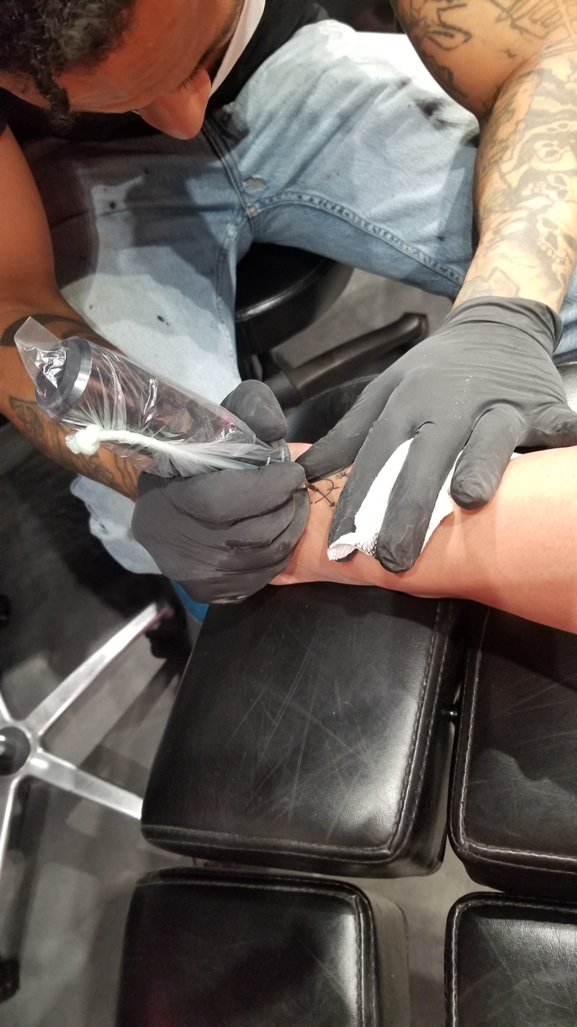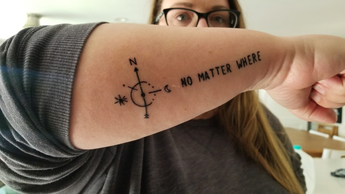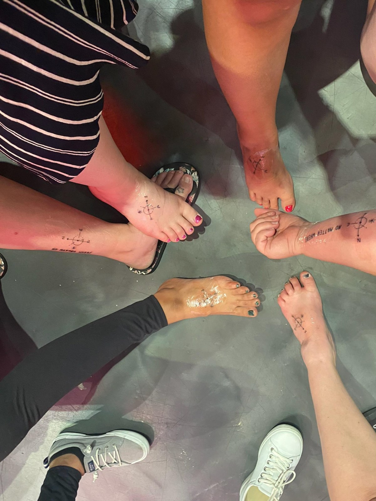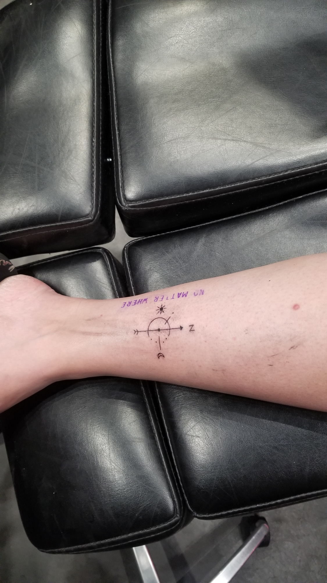 We walked around some more and then headed back to the hotel to chill for a bit. We at some point made it to the pool. Then we got ready and headed back out. We took a cab to the other side of the strip and went to New York New York. We ended up going to Coyote Ugly for a while – longer than I thought we would. When we were in line to get in the bouncer told us there was no dancing aloud. We had to stay in our seats – so I asked him if we could dance in our seats. That was ok. I think we all got a bit toasty there. We decided to wonder out a bit more. I think the combo of the excitement of being with everyone and the boos we ended up at a tattoo shop. We all ended up with a tattoo. It’s a compass to represent that no matter where we are physically and in life we will always be friends. My sister and I added the words no matter where to ours and everyone else just got the compass. I have to say I like it but had I not been a bit drunk I probably would of got it a bit smaller and bit different location. We did some other…Vegas things…the kinda that stay in Vegas :).