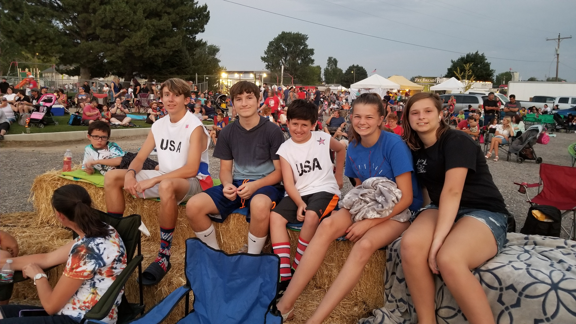 When it was starting to get dark some of us headed to the school to watch the fireworks up close. Because my cousin is on the committee she had VIP access. We were able to pull into reserved parking and sit super close to the field on some nice hay bales. This is so cool because there are 1000s of people and typically to even park you’d have to be there hours ahead of time. It felt like we were VIP.